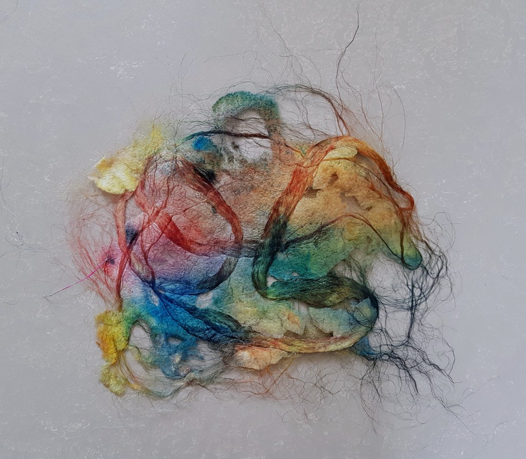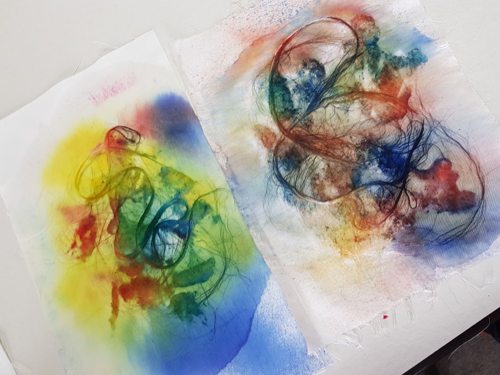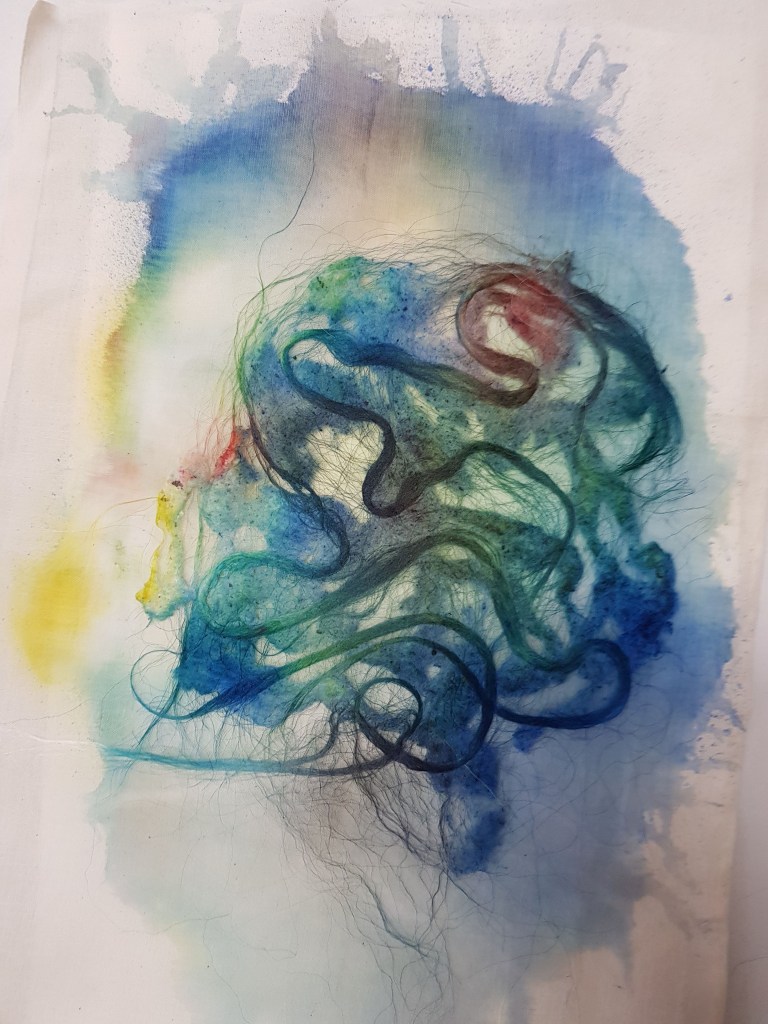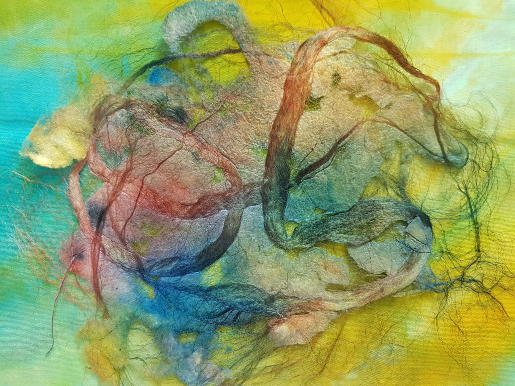 Gisteren was het weer tijd voor Achterdoek. Deze keer leerde Bea ons te werken met zijdevezels en zijdeverf. Het was erg leuk om te doen en met de resultaten kunnen we thuis verder aan de slag.