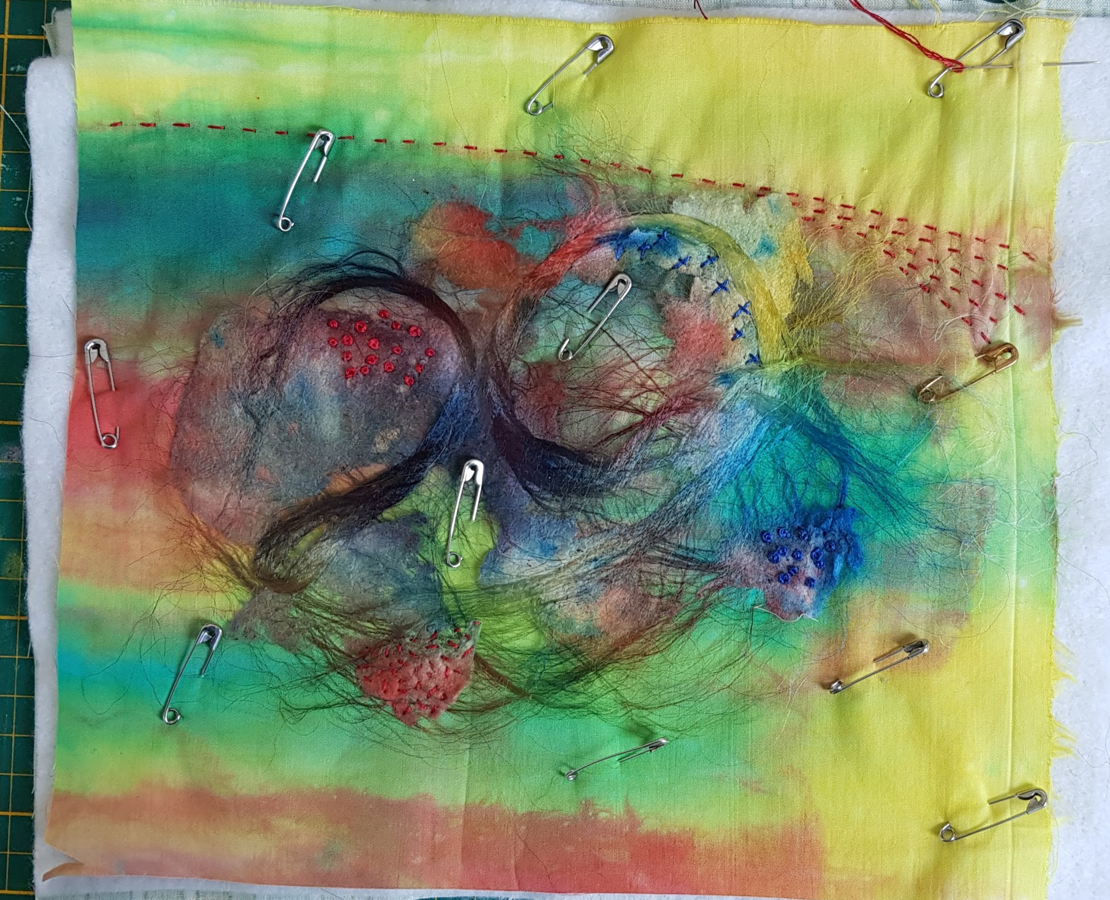 Mijn derde werkje heb ik met kleine stukjes vliesofix vastgemaakt op een ondergrond en ben ik nu met borduursteken aan het bewerken.