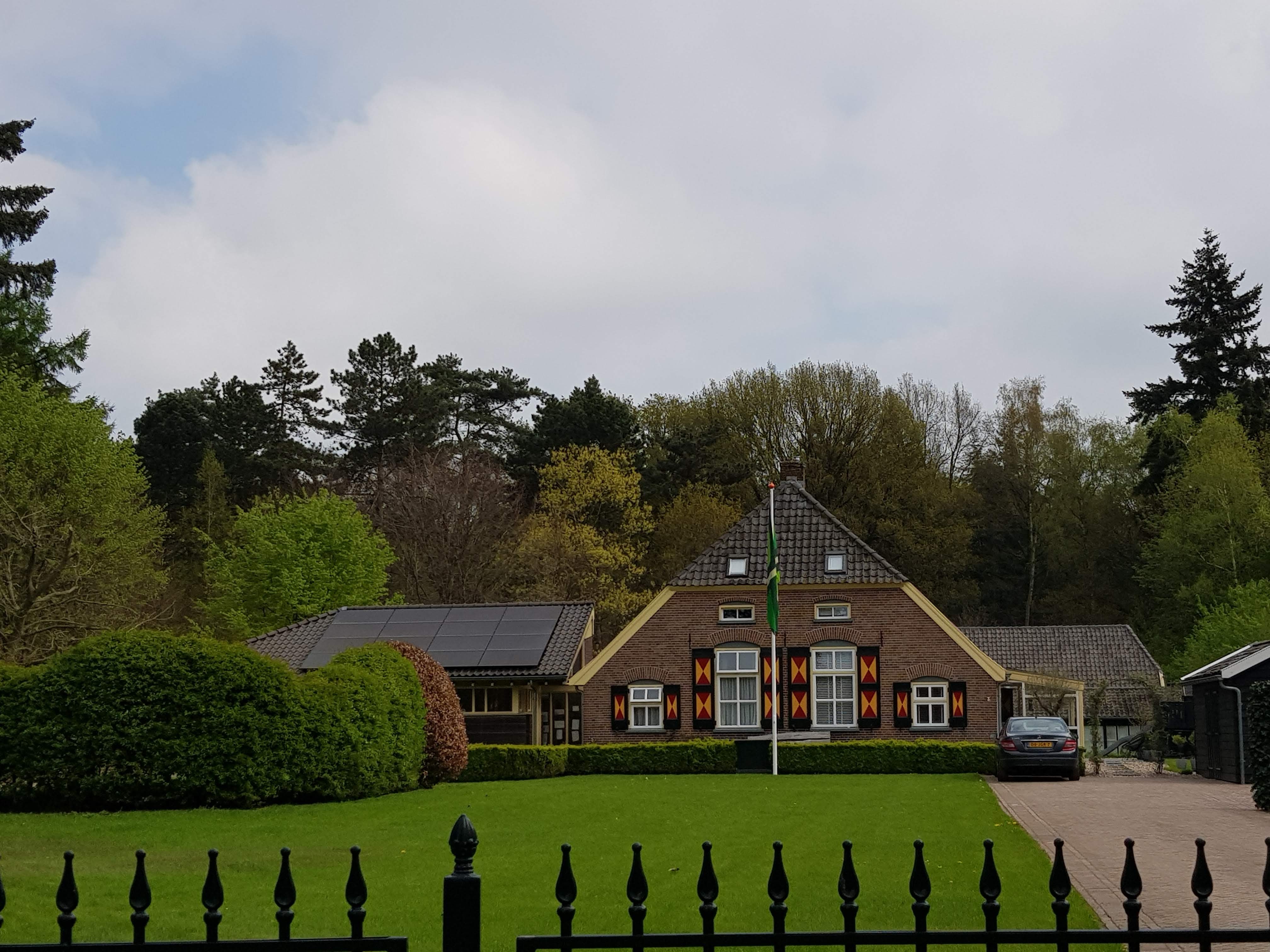 De boerderijen met de mooie luiken met een rode diabolo op een gele achtergrond zijn van landgoed Enghuizen, de kleuren zijn afgeleid van het wapen van de familie Van Heeckeren, lange tijd eigenaar van dit landgoed.
