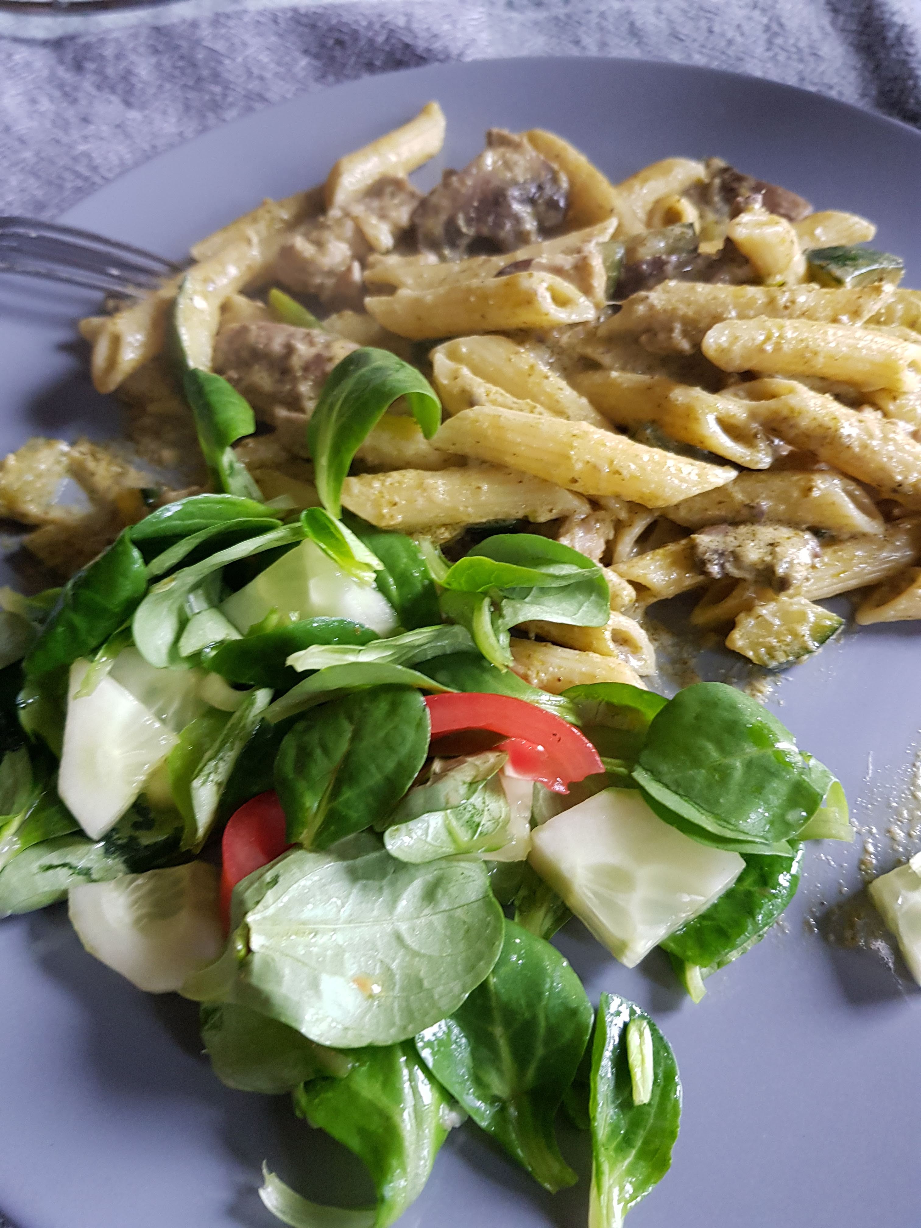 Lia had vanavond heerlijk voor ons gekookt, pasta met kip en pesto.