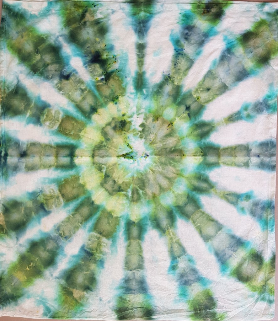 Vandaag was het erg warm buiten en ik ging binnen aan de gang met ijsblokjes. Ik had twee witte kussenslopen die ik wilde verven met een kaleidoscoop patroon. Eerst de stof voorgeweekt in water met soda en nog nat gevouwen en opgerold. In een bakje met gaatjes geplaatst, ijsklontjes erover en verfpoeder in 4 verschillende kleuren. Het geheel in een groter bakje gezet en gewacht tot de ijsklontjes waren gesmolten.