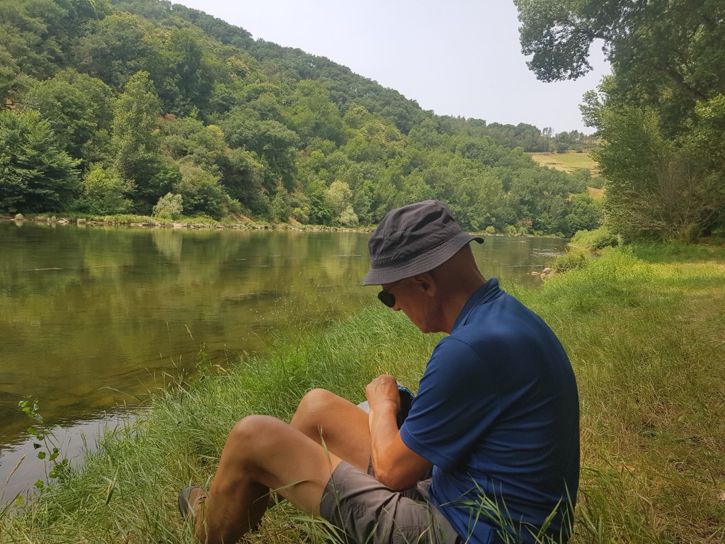 We hoorden voortdurend vogels en krekels en bij de rivier kikkers en zagen talloze vlinders in allerlei kleuren, insecten en hagedisjes en genoten van de heerlijke kruidige geuren. Na een tijdje daalden we weer af naar de Tarn waar we heerlijk hebben gezeten.