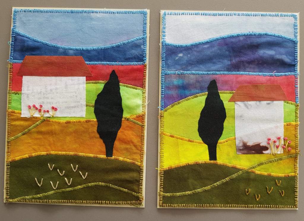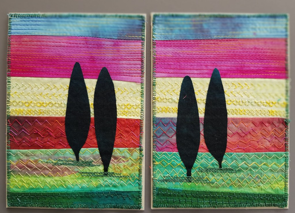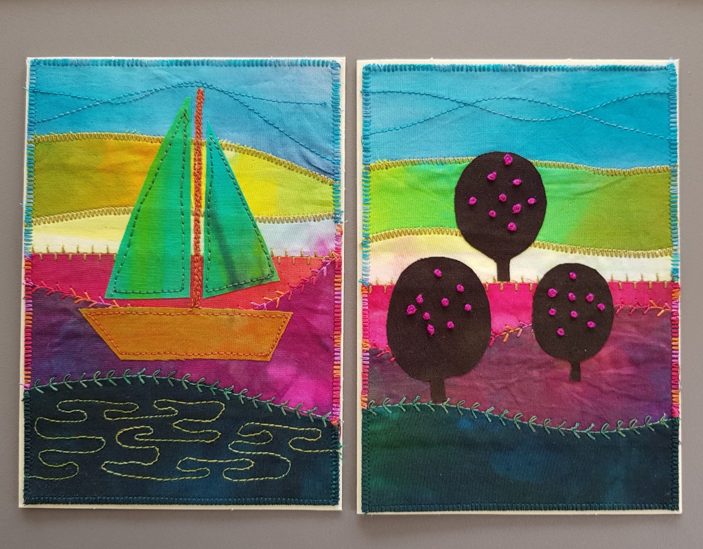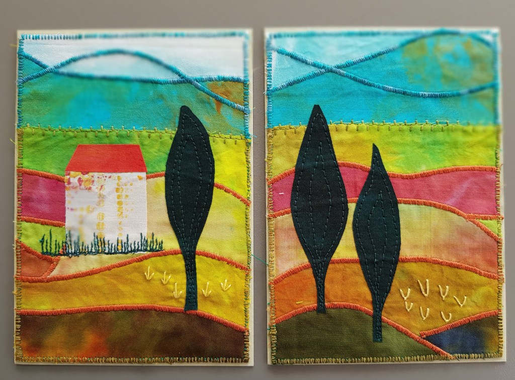 En weer een stelletje kaarten van restjes stof, de voorraad is nog lang niet op! Deze keer een paar met gebogen vormen, ook leuk om te doen en bij de kaarten links onder heb ik siersteken van de naaimachine gebruikt.