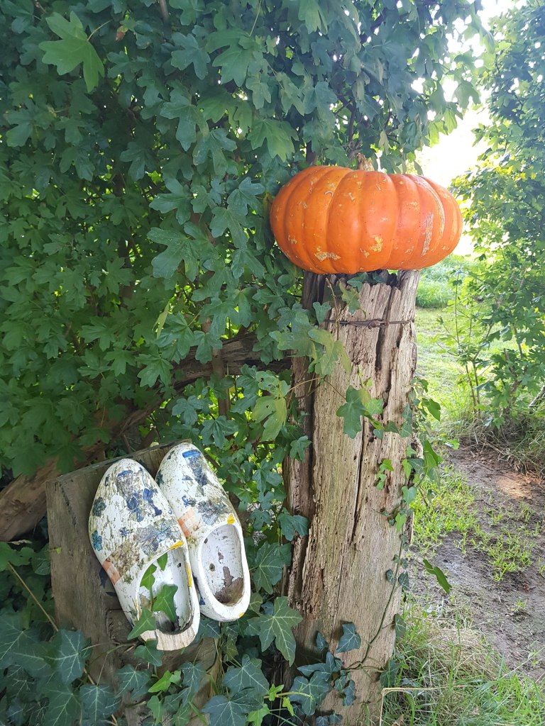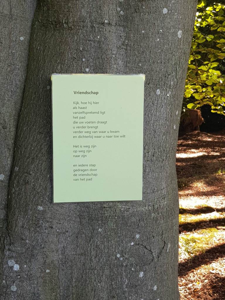 Onderweg kwamen we veel bankjes tegen, we hadden koffie/thee meegenomen en brood zodat we af en toe een pauze in konden lassen. Een mooi gedicht op een boom en de herfst komt er ook al aan met pompoenen.