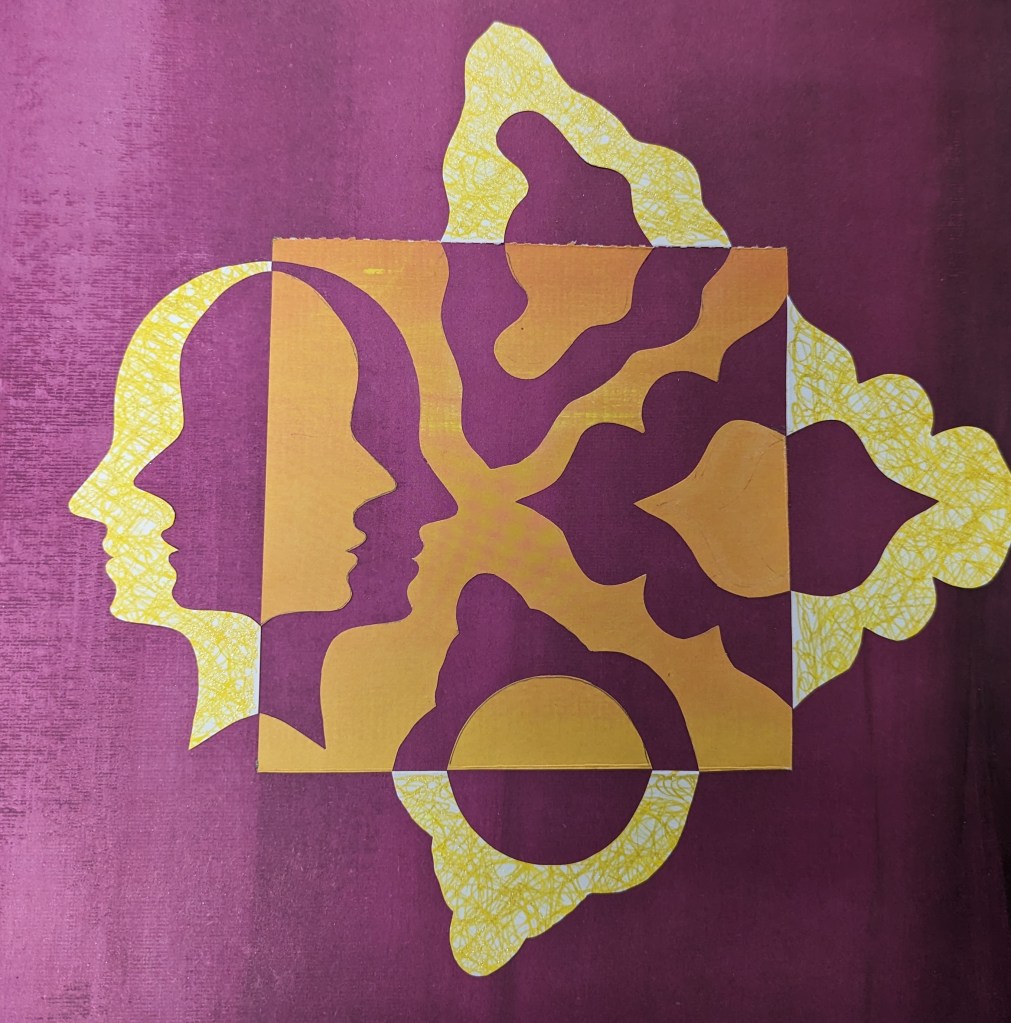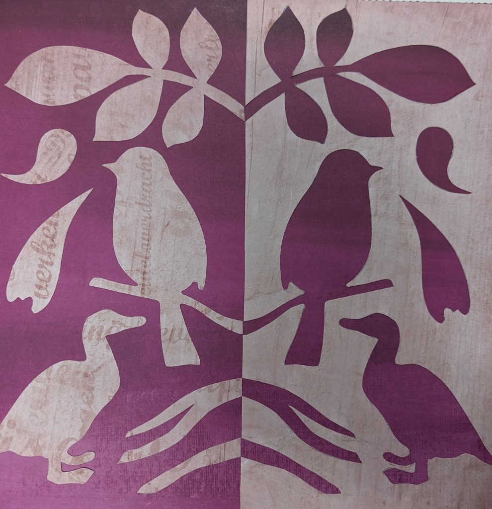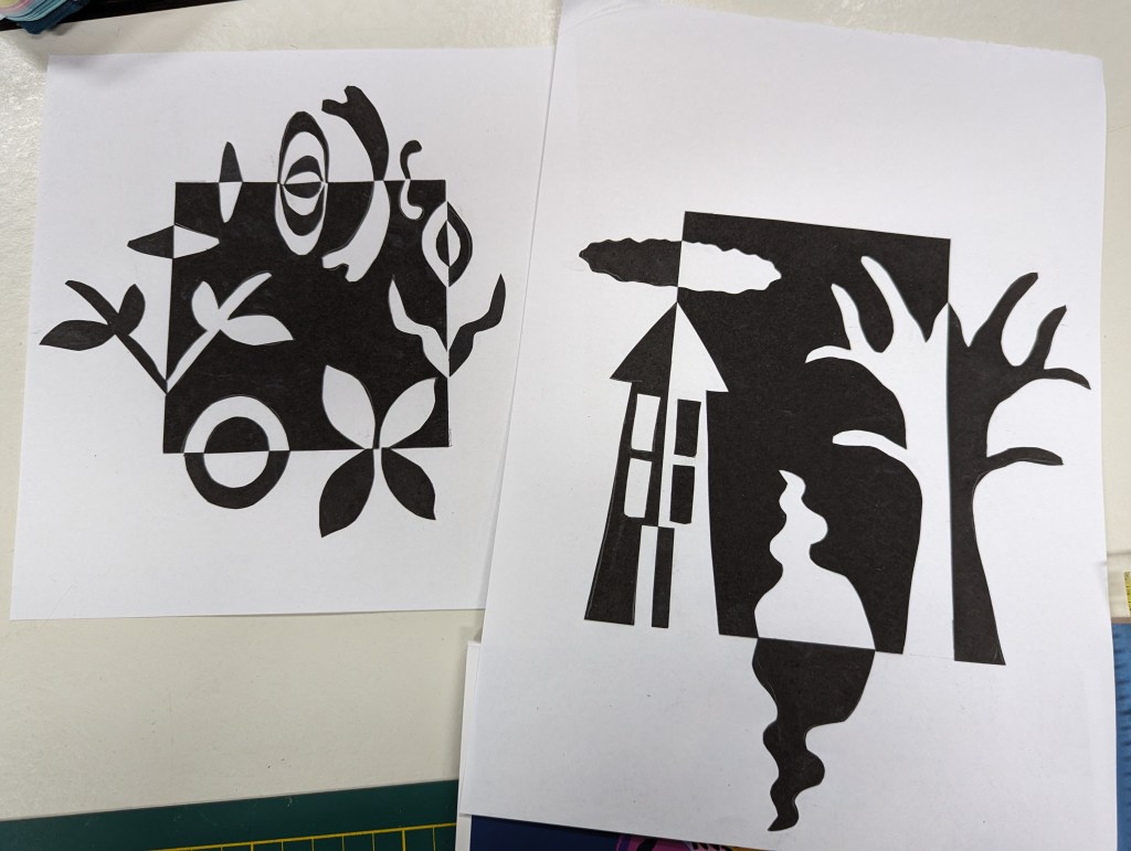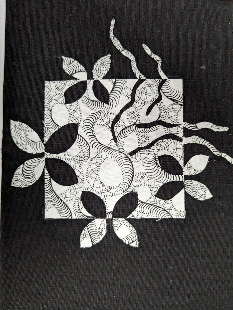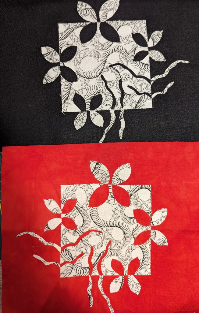 Hierbij ga je uit van een wit vel papier en een kleiner zwart vel. Je tekent eerst wat figuren op het zwarte papier, je kan ook uit de vrije hand werken. Wat je uit het zwarte vel knipt sla je om en plak je op het witte vel. Ik heb het ook met stof geprobeerd, dan werkt het iets anders, je neemt dan 2 stukjes stof waar je vlisofix achter strijkt. Omdat je met een dubbele stof werkt kan je twee notans maken, thuis heb ik er één op rode stof gestreken, deze is dan het spiegelbeeld van de andere. Het lijkt ingewikkeld, maar je moet het doen om het te begrijpen.