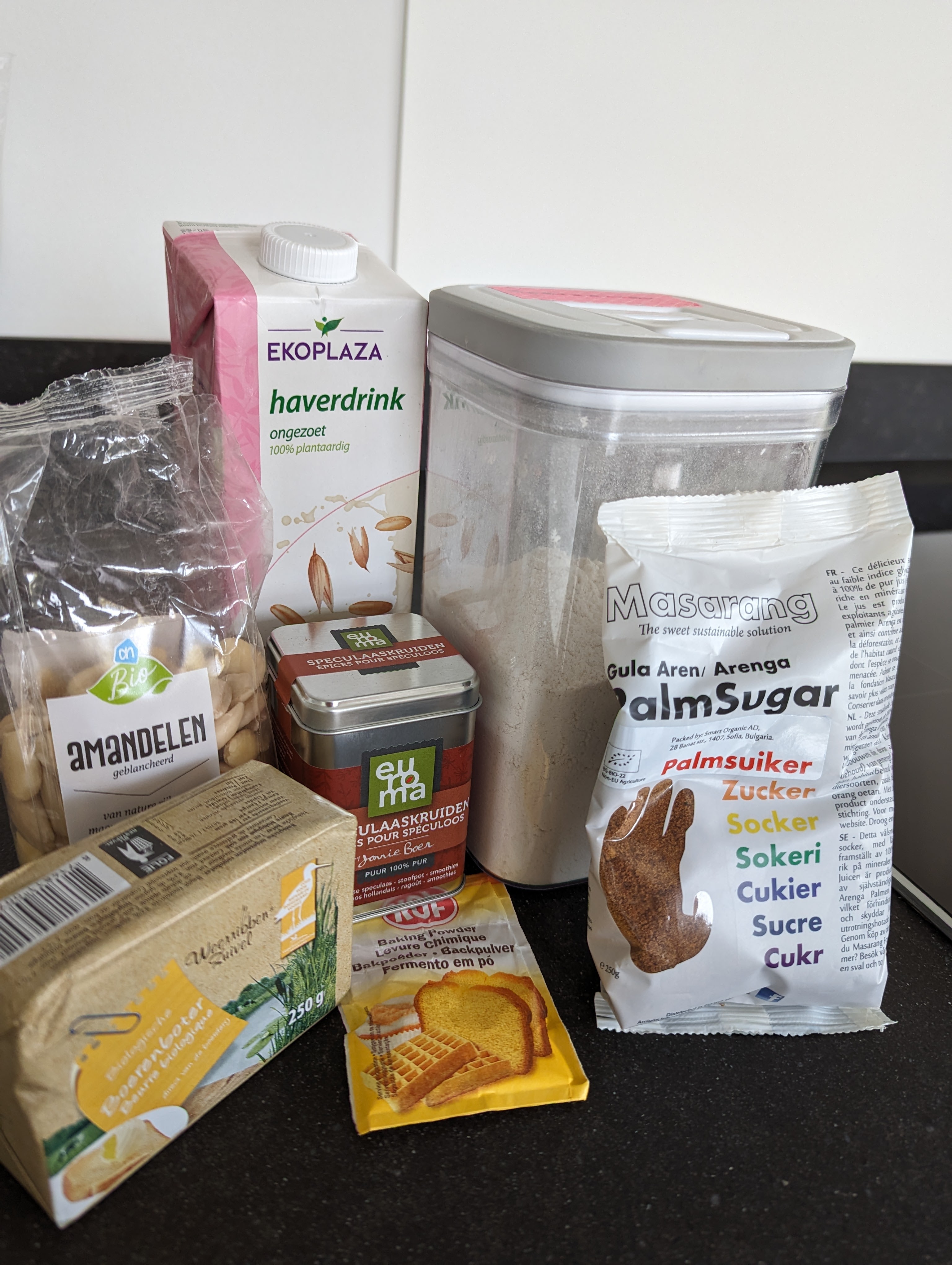 250 gram speltbloem, 5 gram bakpoeder, 100 gram palmsuiker, 100 gram zachte roomboter, snufje zout, 2 flinke eetlepels speculaaskruiden, 3 à 4 eetlepels melk, wat blanke amandelen.
