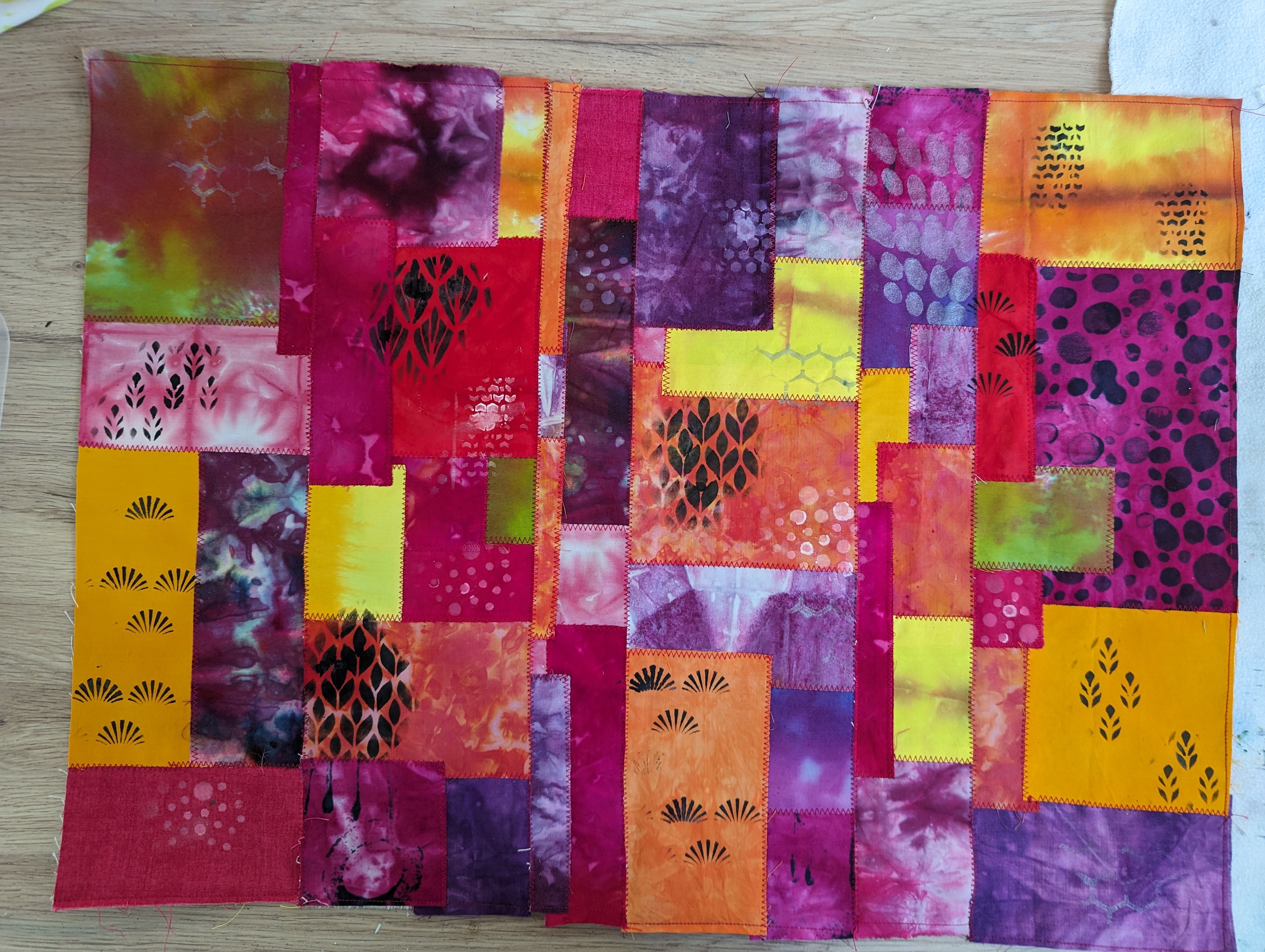 Deze Quilt gaat echt een kleurrijke schoonheid worden, mooi idee om er bloemmotiefjes op te stempelen, en t.z.t met de opgenaaide bloemen zal het helemaal een juweel worden!!! Leuk ook om de Notan techniek weer tegen te komen.