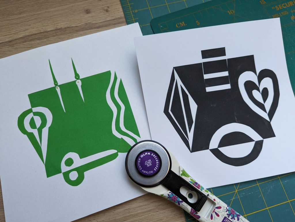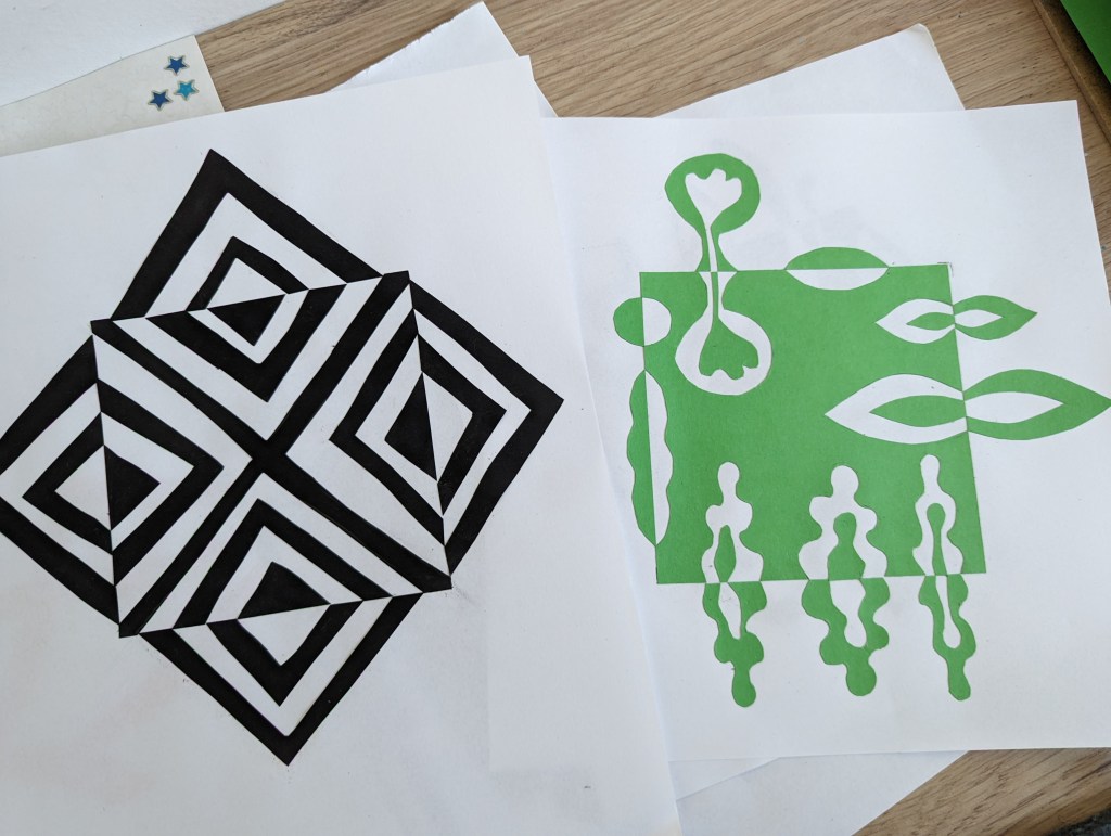 Ik heb met zwart wat bloemmotiefjes gestempeld en ook wat rondjes met wit en zilver. Het quiltje ga ik verder versieren met opgenaaide bloemen en quiltsteken. Na de lunch hebben we zitten knippen en plakken op z’n Japans: Notan.