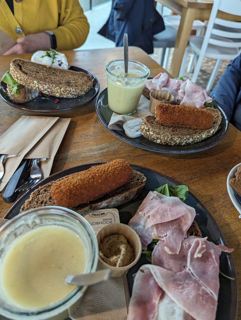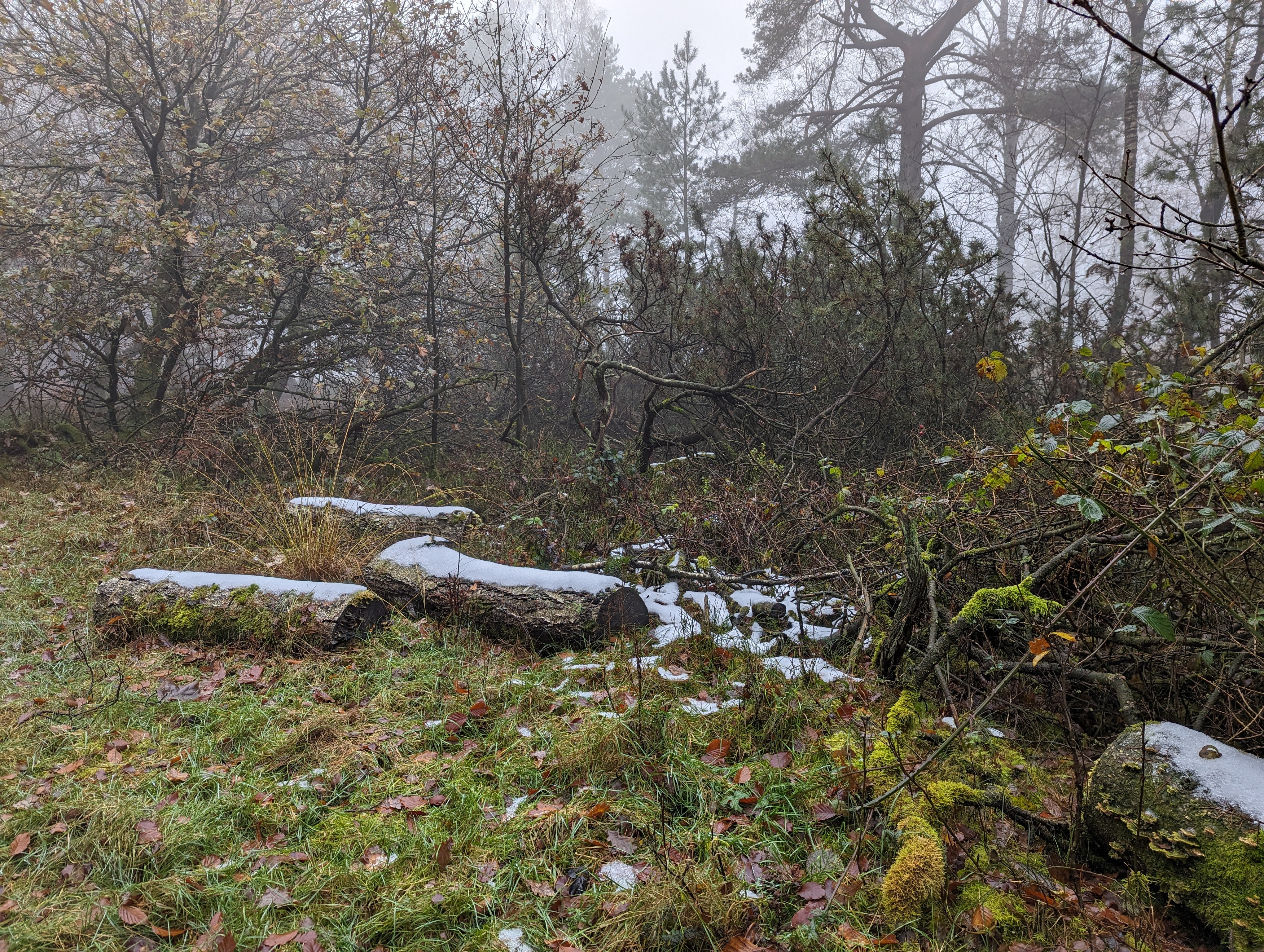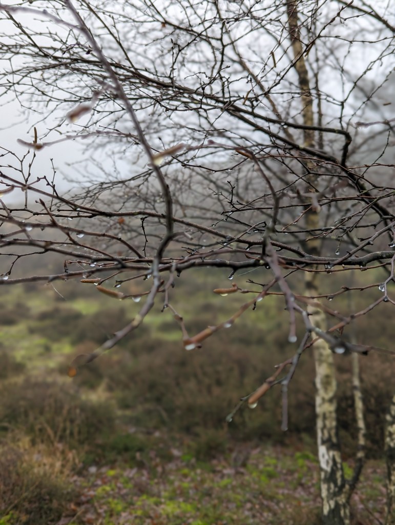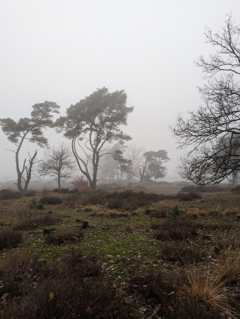 We hebben heerlijk zitten lunchen bij Paviljoen de Posbank. Door de mist was het vrij vochtig maar gelukkig werden we er niet echt nat van. De druppels bleven mooi aan de takken hangen.