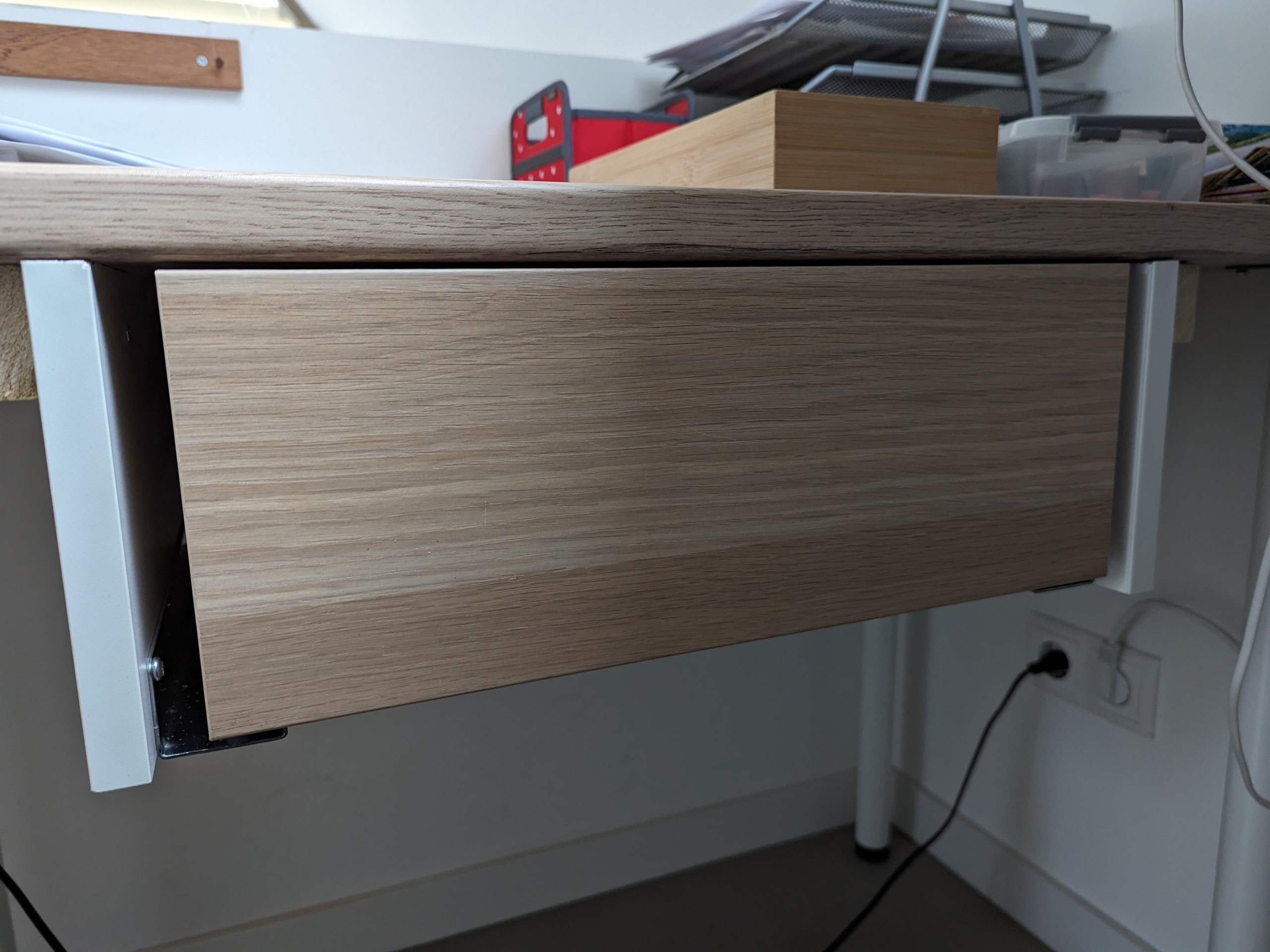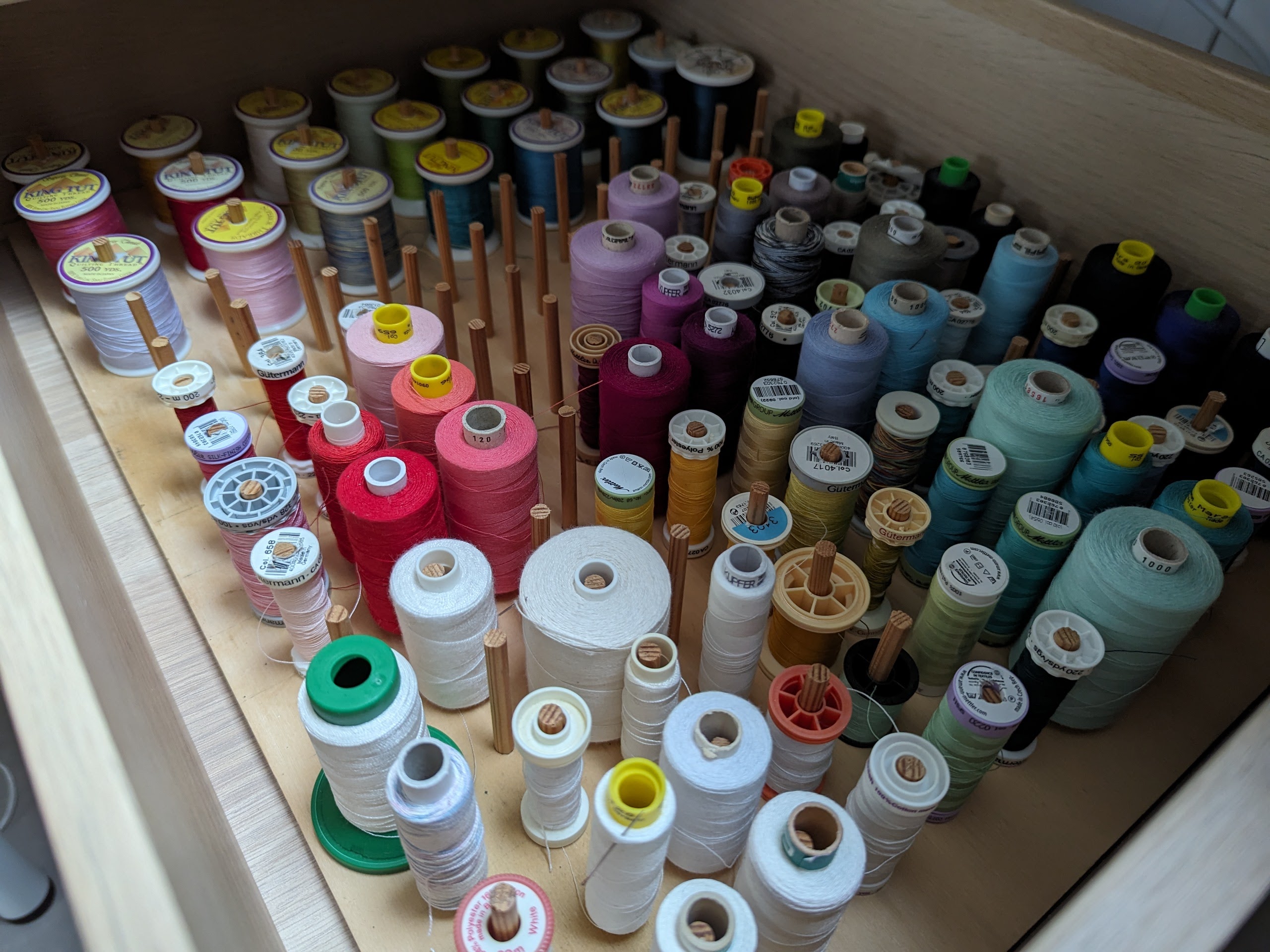 Mijn garenklosjes staan op een plank met pinnetjes, maar omdat ik geen plaats had in mijn hobbyhoekje schoof ik deze plank altijd onder het logeerbed, niet echt handig. Nu heb ik gelukkig wel een handige man die hiervoor een oplossing bedacht. Hij bevestigde een lade van Ikea onder mijn werkblad, zaagde een stukje van de plank af zodat hij er in past en voilà, reuze handig direct naast de naaimachine.