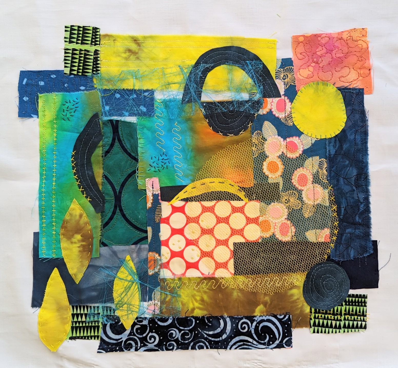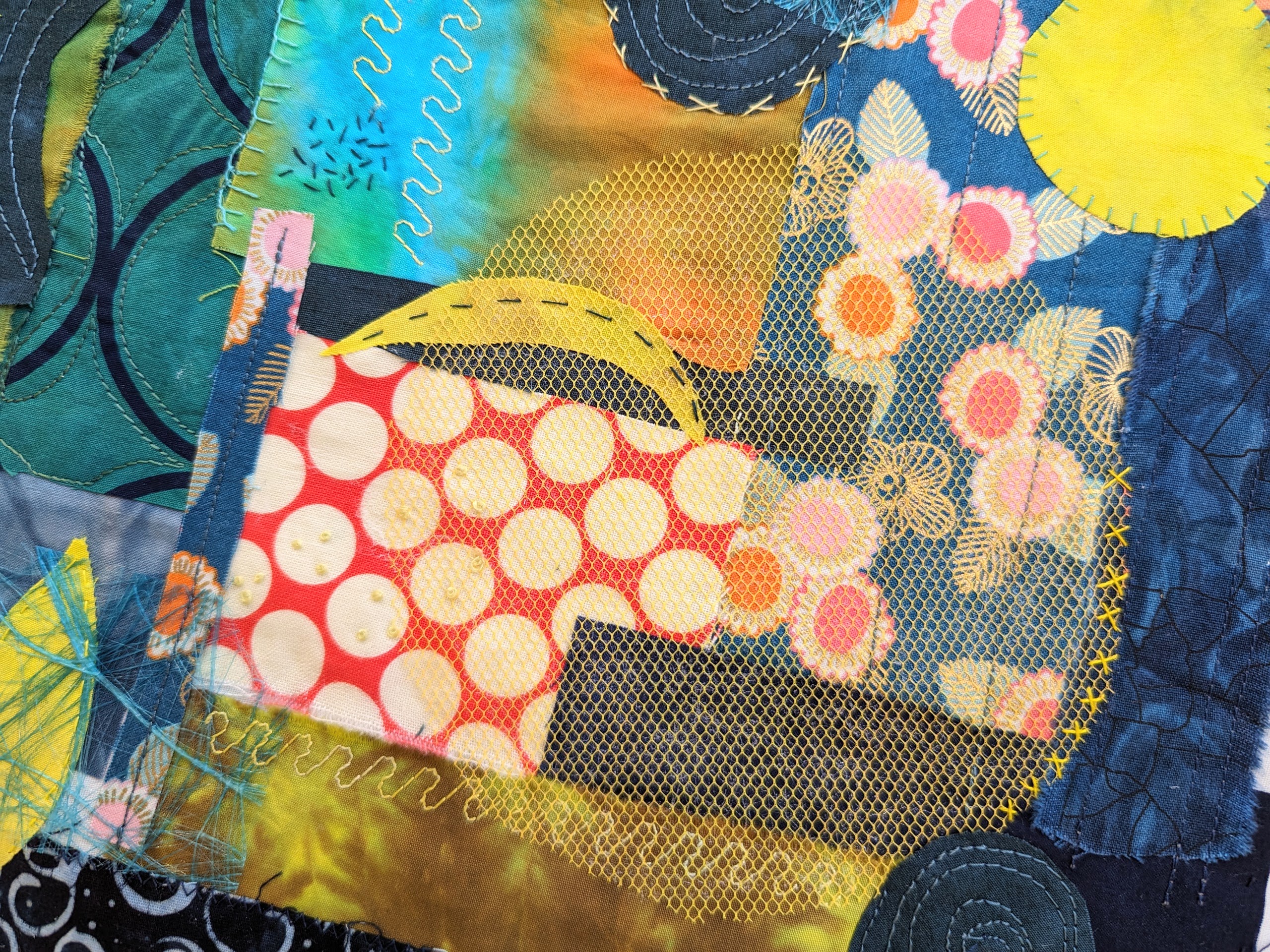 Ik weet nog niet hoe ik hem ga afwerken, ik kan er een klein quiltje van maken of het geheel vastmaken op een canvas. Ik heb zowel met de naaimachine als met de hand steekjes geplaatst.