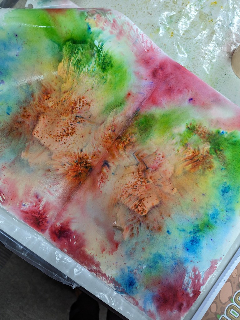 Gisteren bij Achterdoek weer iets nieuws geleerd, nl. verven met brusho. Dit is een pigmentpoeder wat je kan gebruiken op papier, hout en canvas. Je gebruikt het met water, je kan zowel eerst wat poeder op je ondergrond doen en daarna natspuiten als eerst de ondergrond nat maken en daarna het poeder erop strooien. Het is wel handig om wat steviger papier te gebruiken, door al het water zou het anders snel scheuren.