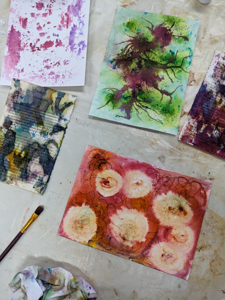 Met een penseeltje gedoopt in een bleekwateroplossing kan je weer wat verf wegkwasten, ook kan je stencils gebruiken, er zijn diverse mogelijkheden. Eén van de leden had een hele set potjes met brusho poeder die we mochten gebruiken, je hebt er gelukkig maar heel weinig van nodig. Dit zijn een paar van mijn vellen, ik heb ook wat op stof gedaan.