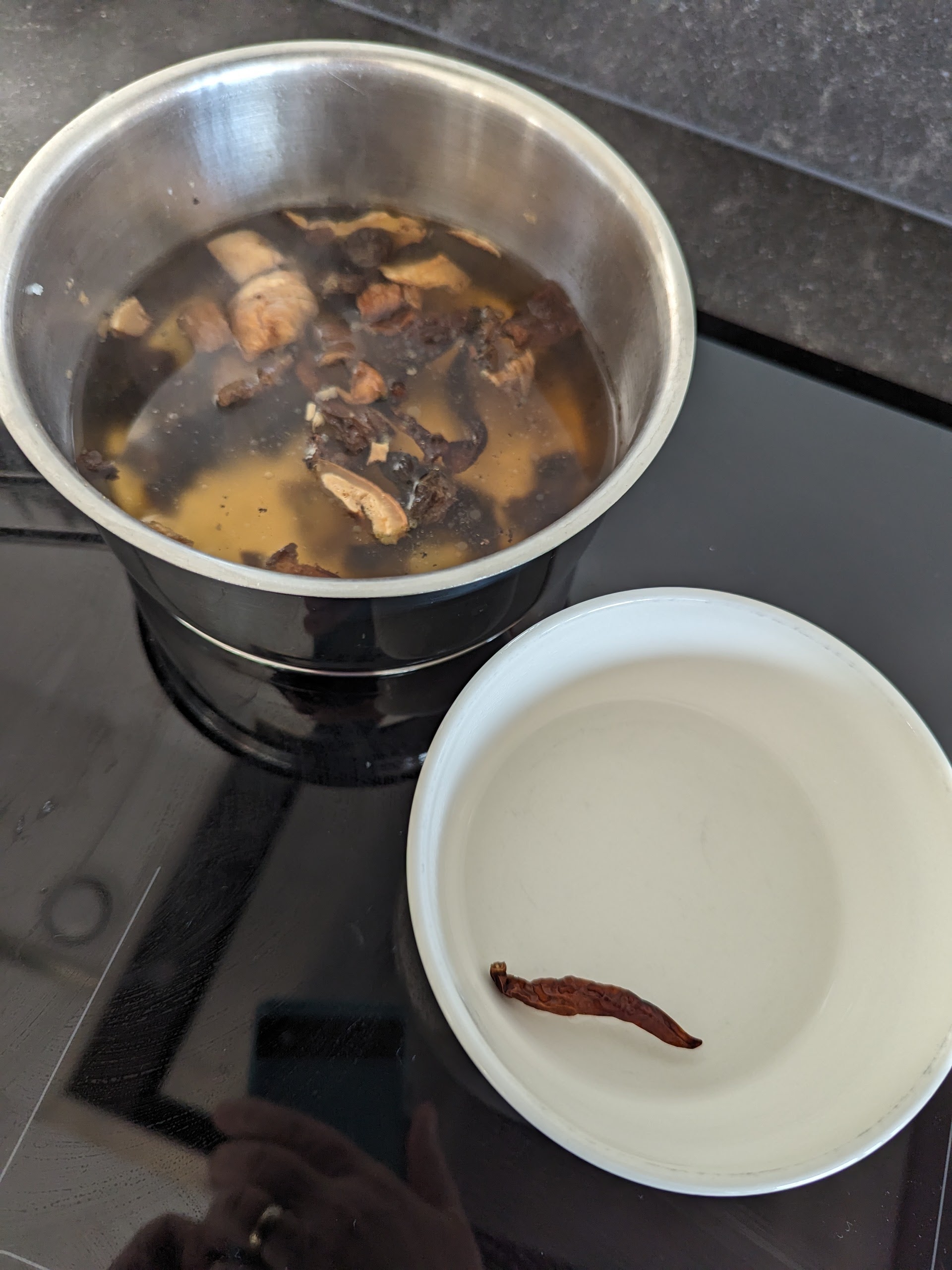 1 kleine gedroogde chilipeper, 15 gram gedroogde porcini, 250 ml groente- of kippenbouillon, 250 gram oesterzwammen, 250 gram kastanjechampignons, 1 ui, 4 teentjes knoflook, 1 kaneelstokje, 2 anijssterren, 4 dadels, 60 ml olijfolie, 150 gram basmatirijst, 2 bosuitjes, zout en peper. Je kan ook abrikozen gebruiken i.p.v. dadels.