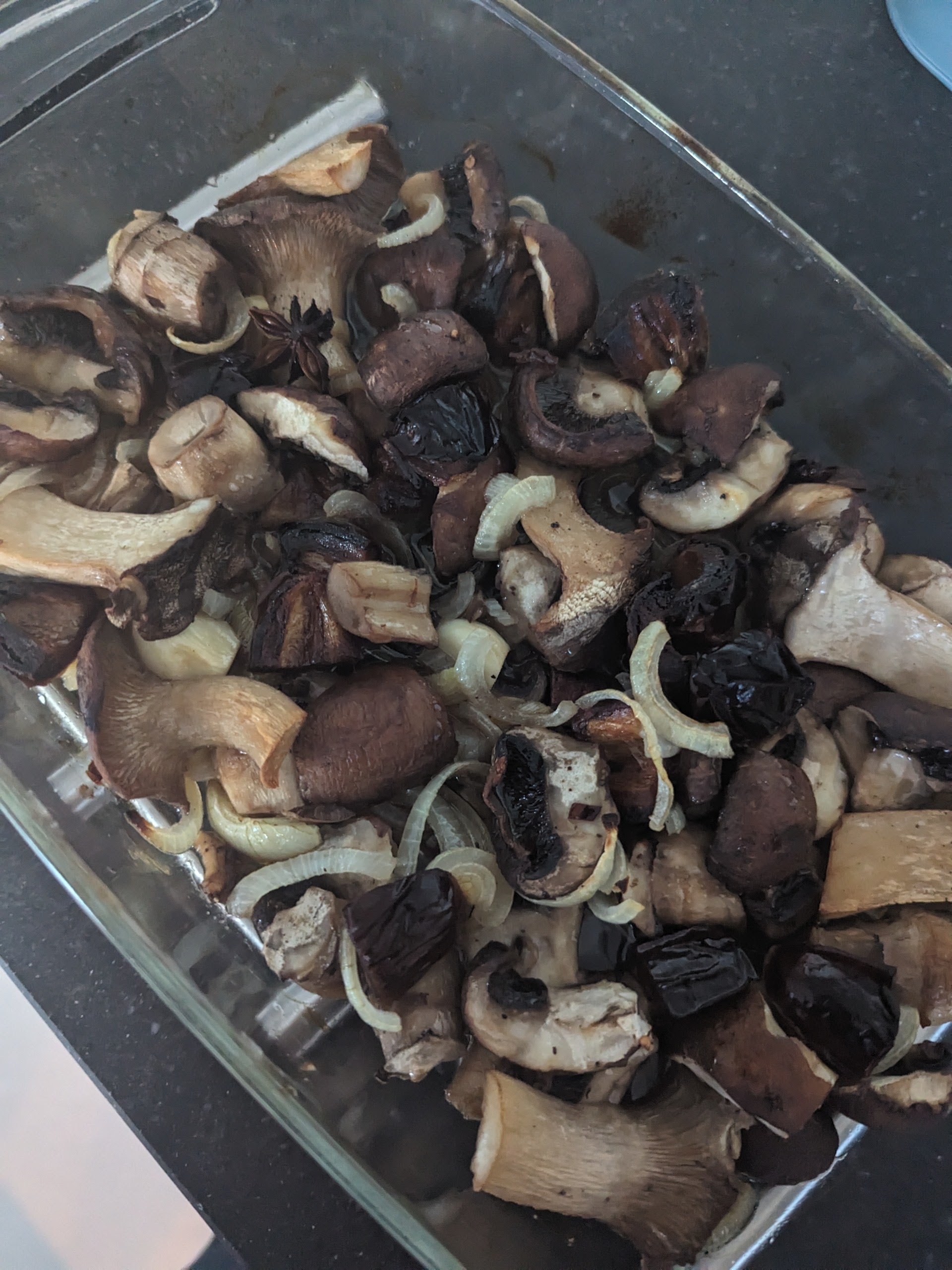 Snijd of scheur de paddenstoelen in grove stukken en doe ze samen met de in halve ringen gesneden ui, gepelde knoflookteentjes, gehakte chilipeper, in stukken gesneden dadels, kaneelstokje en steranijs plus 50 ml olie, zout en peper in een braadslee of ovenschaal. Schep alles goed door elkaar en zet de schaal 40 minuten in de oven, roer halverwege een keer om. Het mag lekker bruin worden.