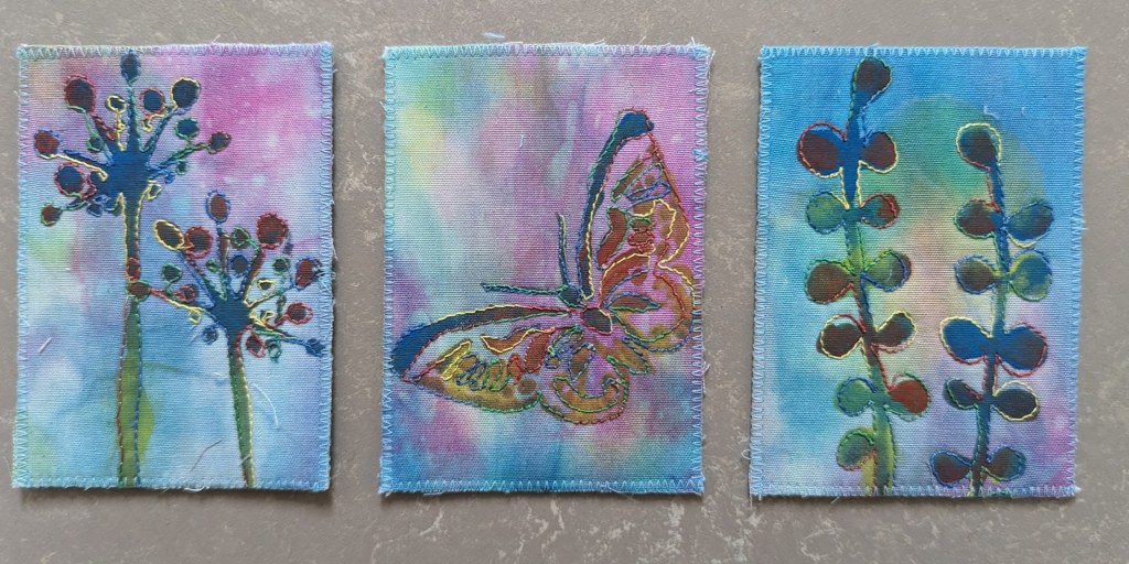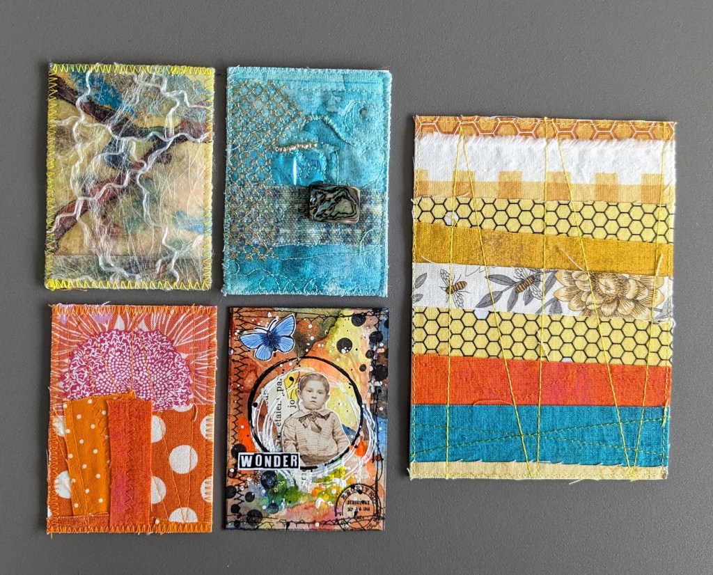 Iedereen hoefde maar drie kaartjes te maken en kreeg er vier terug, omdat Mieke er zelf voor iedereen ook eentje maakte. Dit zijn de kaartjes die ik gestuurd heb, elk kaartje is 2,5 x 3,5 inch.