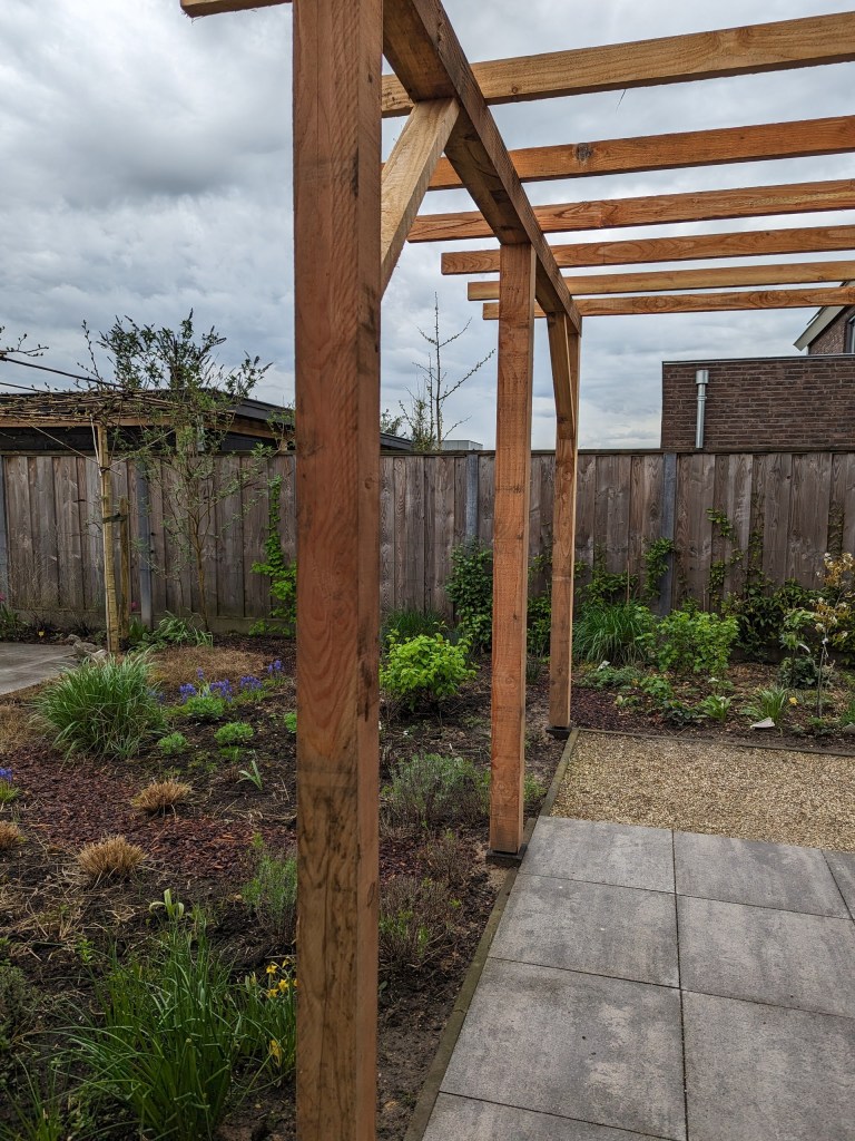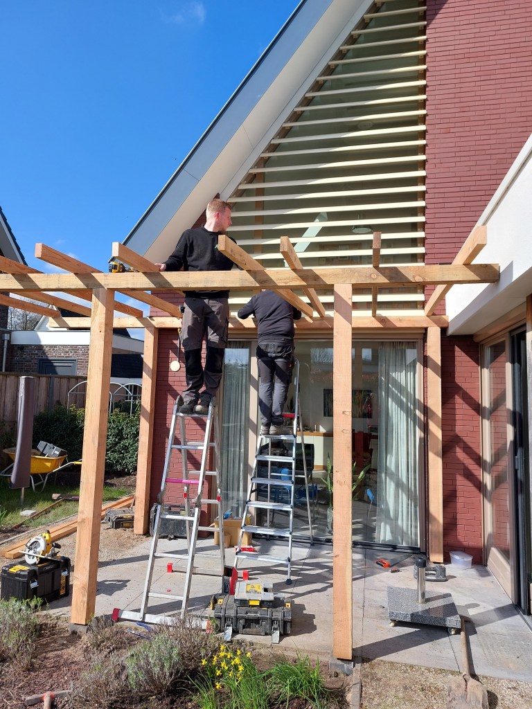 Het kleine terras direct achter de woonkamer is in de zomer vaak te warm, maar wel een fijn plekje om samen te lunchen of thee te drinken zo tegen het huis. We kregen het idee om een pergola te (laten) plaatsen en daar snelgroeiende klimmers tegenaan te planten, zoals een druif en clematis. Hopelijk geeft dat voldoende natuurlijke schaduw. Hier zijn de tuinmannen van AVhovenier lekker bezig, gelukkig scheen die dag de zon en was het droog.