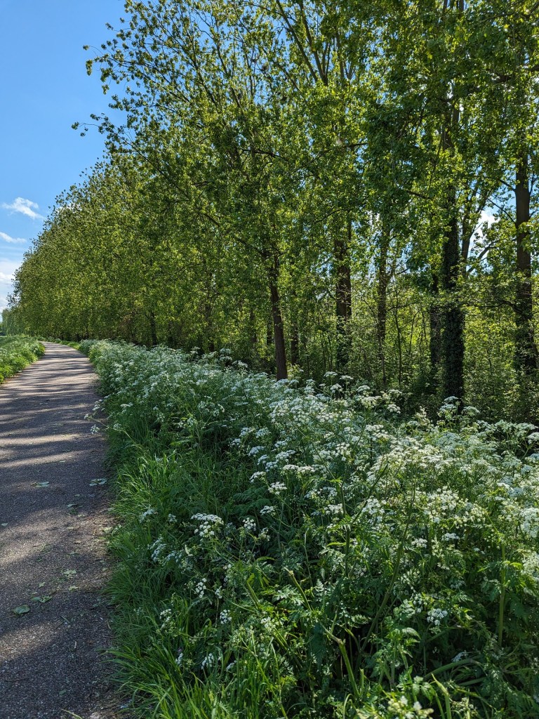 Vandaag is het hier heerlijk, na de werkzaamheden en boodschappen van vanmorgen hebben we vanmiddag een wandeling in de omgeving gemaakt en daarna heb ik eindelijk lekker buiten kunnen zitten. Aan de dijk langs de Oude IJssel bloeit het fluitekruid volop.