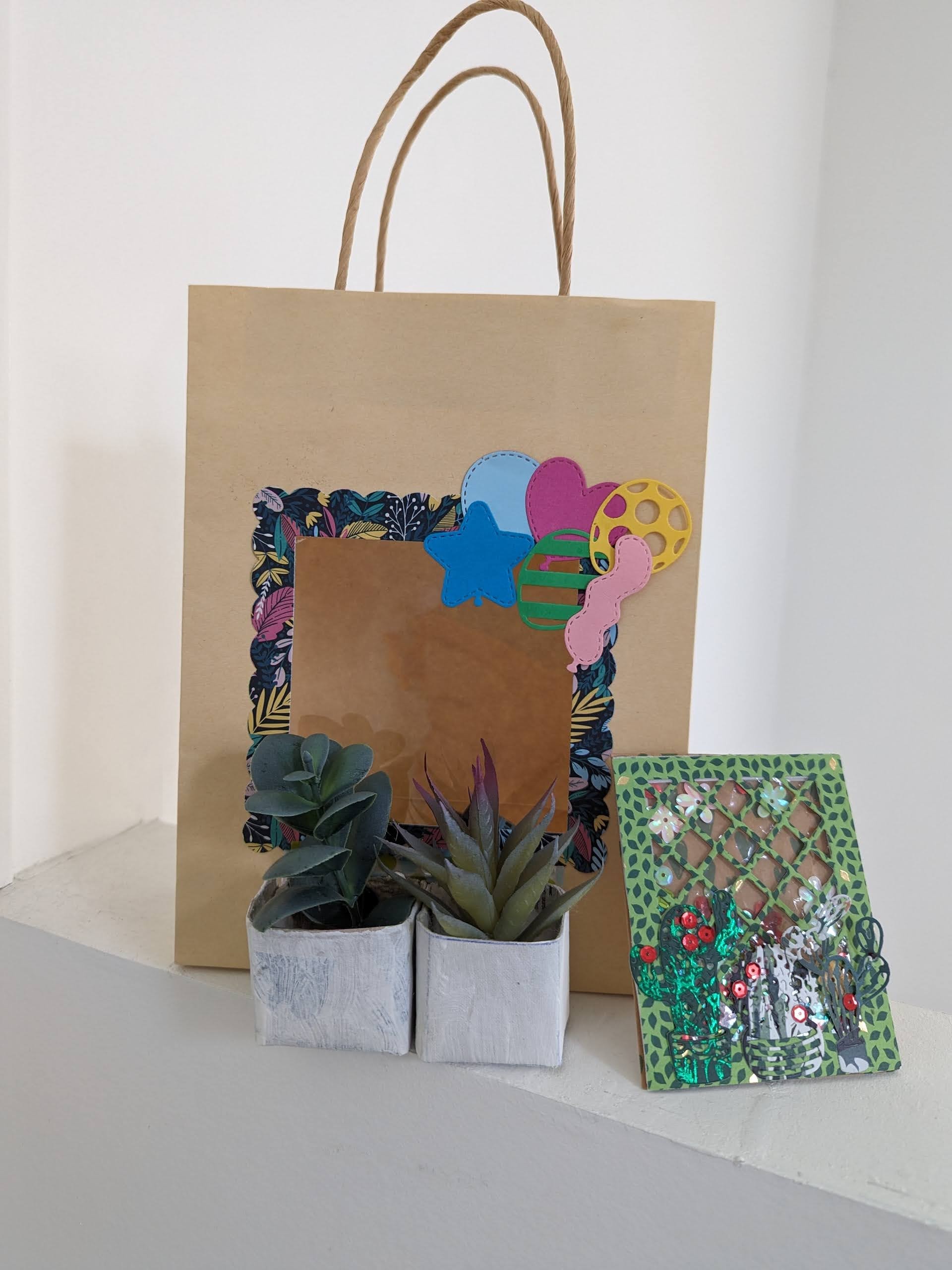 Van de broers en zussen kreeg ik o.a. geld in een mooi envelopje, dit zat samen met de verf verpakt in een leuk cadeautasje, beide gemaakt door jongste zus Marianne.