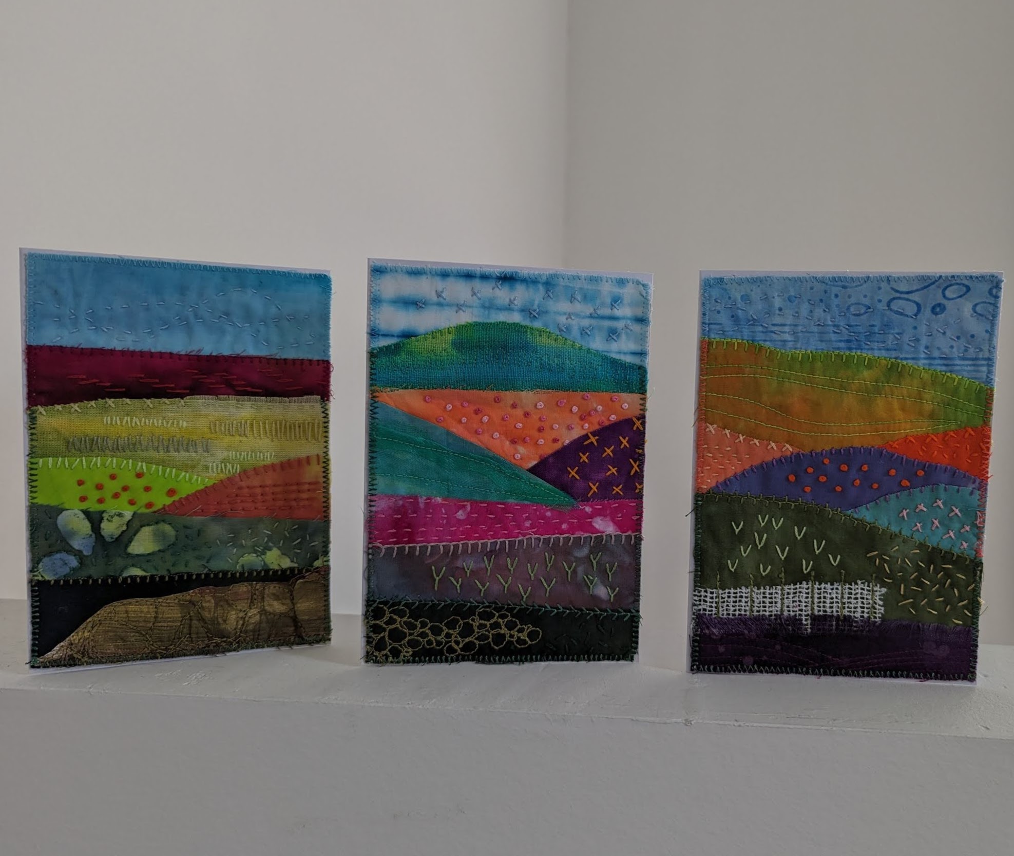 Hier heb ik de kaarten zowel met de hand als met de naaimachine bewerkt.