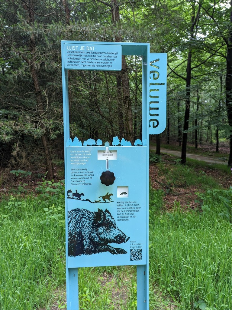 Het zonlicht werd zo mooi door de bladeren gefilterd en even later kwamen we bij de Carolinaberg aan, vanaf de top van deze heuvel lopen 13 paden in allerlei richtingen, je moet dus wel goed opletten welk pad je moet hebben. Aan het eind van “ons” pad was een nieuw informatiebord geplaatst, je kan aan de knop draaien en dan zie je welke dieren in welk gebied voorkomen.