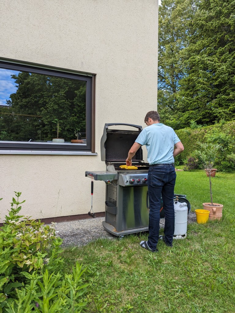 Weer thuis konden we heerlijk buiten in de zon zitten, dat hadden we al een tijdje gemist. Het was zelfs zo lekker dat Derk de barbecue aanstak en we buiten hebben gegeten. Ook het toetje, ananas met kaneel, kwam van de barbecue.
