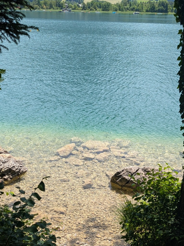 Toen via de Almenweg naar beneden tot we in Strobl kwamen, hier liepen we een heel stuk langs het meer met helder smaragdgroen water.