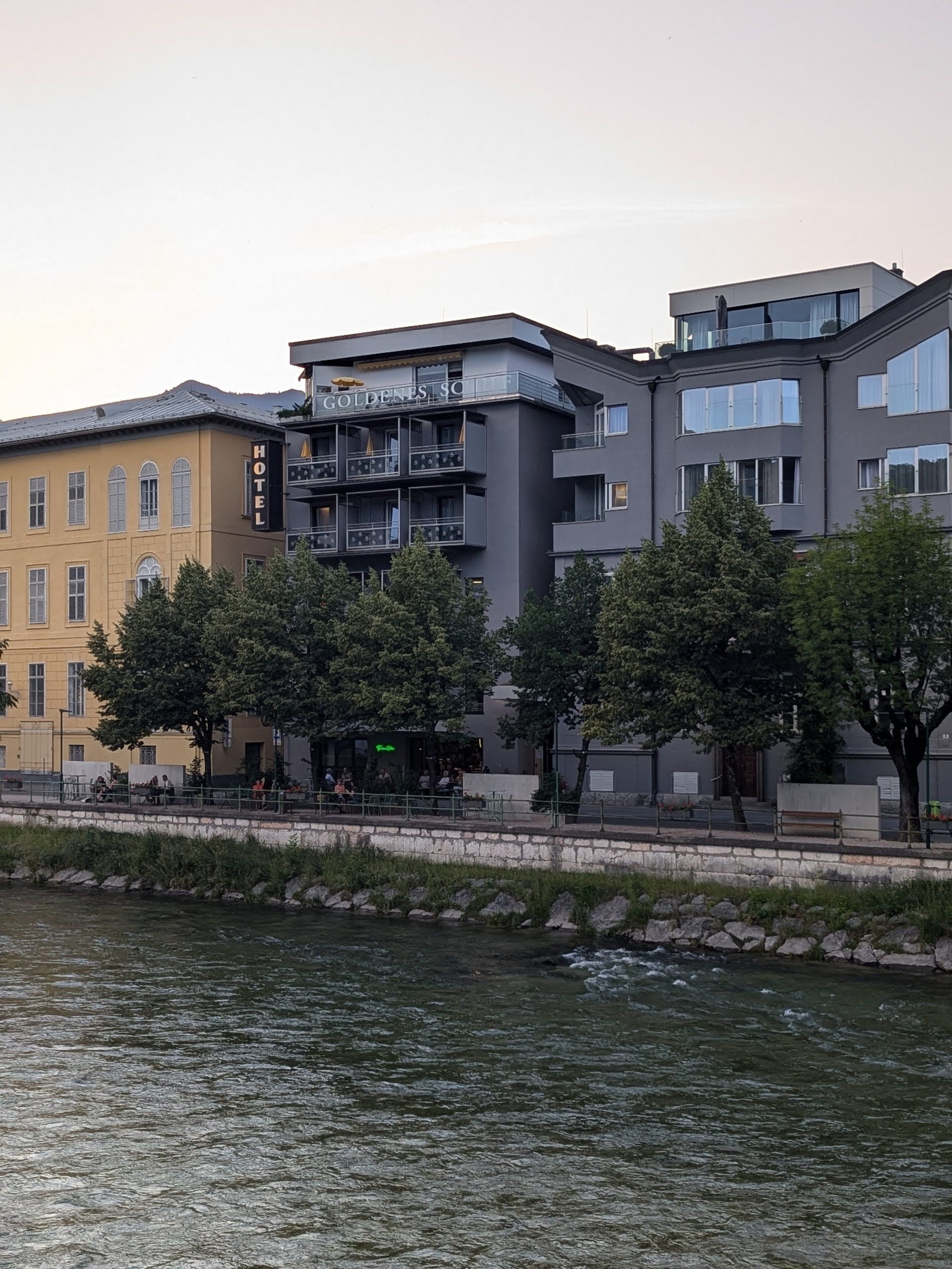 Een stukje verder stapten we op de bus naar Bad Ischl. Het was inmiddels 31 graden en we verheugden ons op een lekkere douche en schone kleren maar helaas was onze bagage nog niet aangekomen in het hotel. Na diverse telefoontjes via de receptie kwamen onze koffers eindelijk rond kwart voor 7! We waren moe en plakkerig en baalden ontzettend, alles wat we nodig hadden zat in de koffers. Snel douchen en daarna hebben we lekker aan het water zitten eten. Bad Ischl is een mooi stadje met prachtige gebouwen.