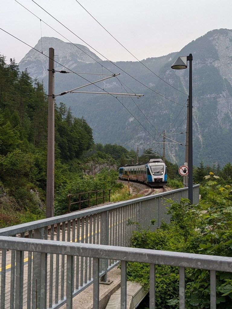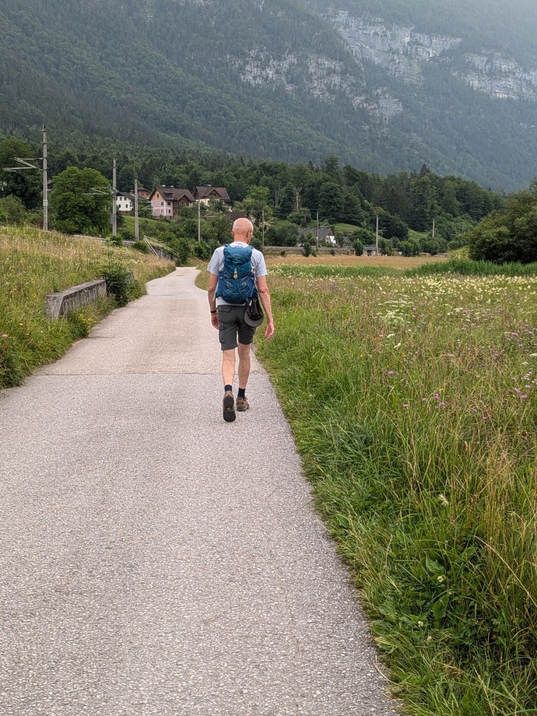 De vierde en tevens laatste wandeldag begon bewolkt en dat bleef het gedurende de wandeltocht, maar het was nog steeds erg warm. We gingen eerst met de boot naar de overkant van het meer en stapten daar op de trein naar Bad Goisern.