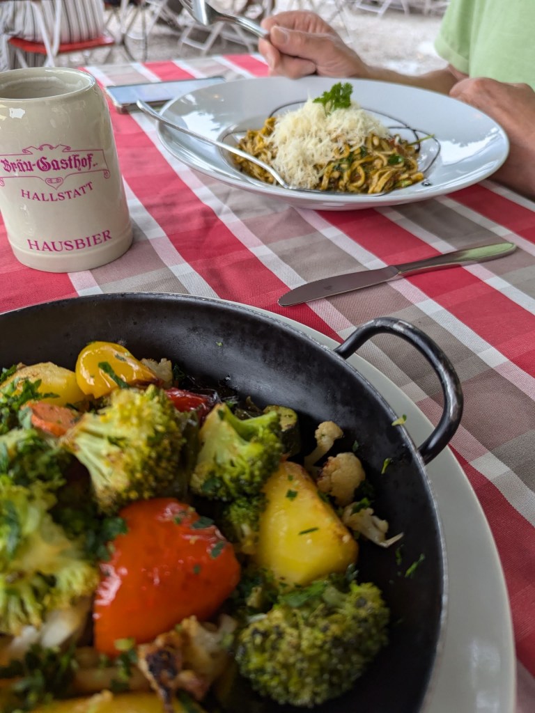 Terug in Hallstatt kon je nog de Salt Mountain beklimmen maar daar hadden we niet zo’n zin meer in, we waren best moe door het warme weer en hebben een poosje op een terrasje gezeten en nog wat door het dorp gewandeld. Voor het diner gingen we weer naar hetzelfde restaurant, dat was ons goed bevallen. De vorige avond wilde ik Sachertorte als toetje maar dat was net op. Ik zei toen tegen de serveerster: misschien morgen, het leuke was dat ze me de volgende dag herkende en direct zei: ik reserveer een stuk voor je. Het was de moeite waard, een heerlijk stuk gebak!