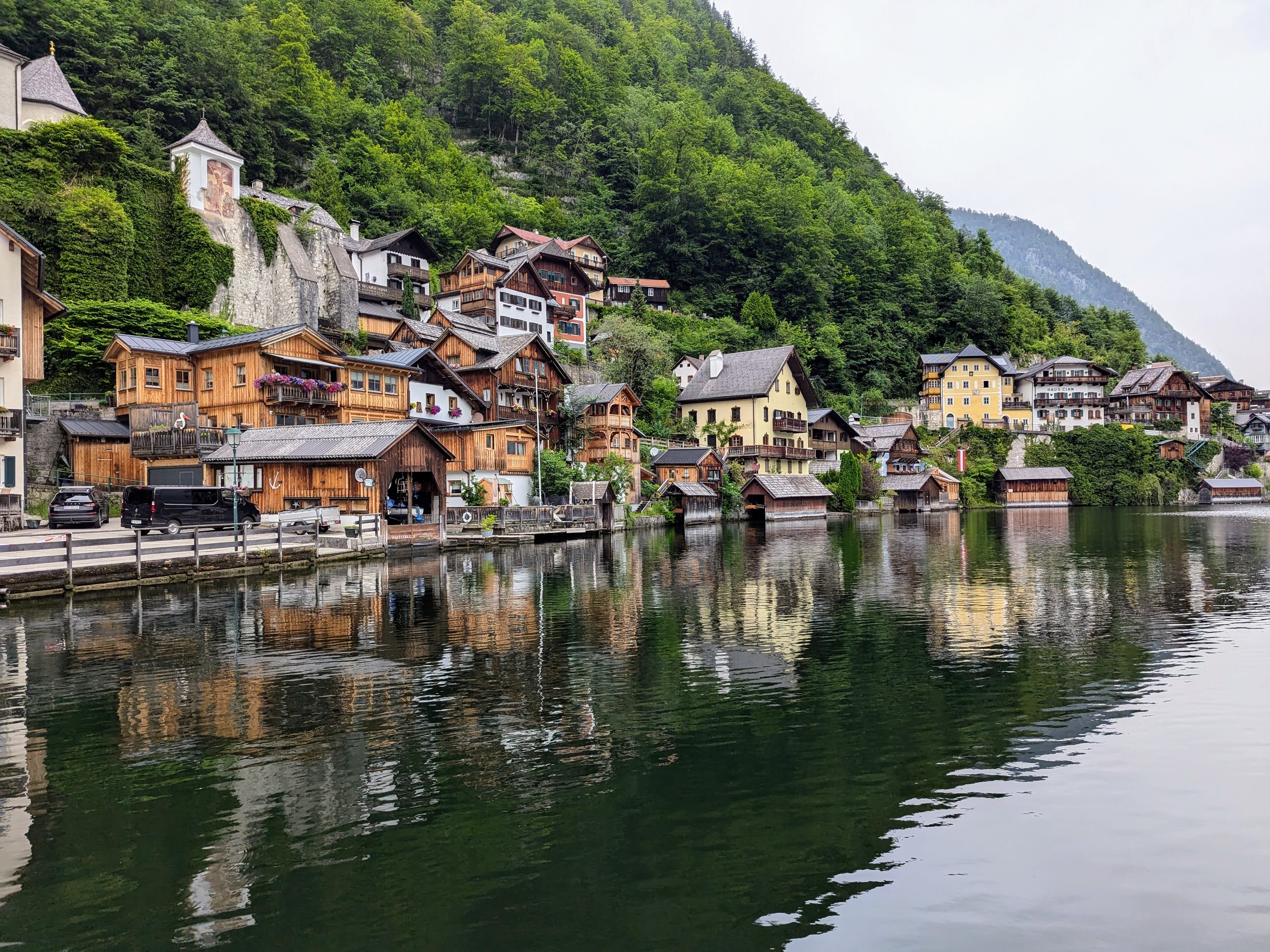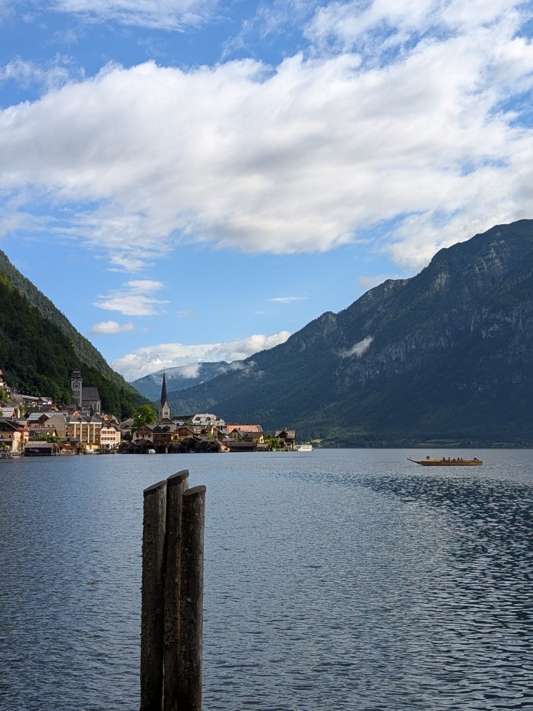 Zaterdagmorgen was het weer tijd om onze auto op te halen bij het eerste hotel in Abersee. We konden met de bus vanuit Hallstatt, wel 2 x overstappen, en ook moesten we nu zelf de bagage meenemen, maar het ging allemaal prima. Het had ‘s nachts behoorlijk geregend, maar nu was het droog met af en toe zon. Nog een laatste blik op Hallstatt en het mooie meer.