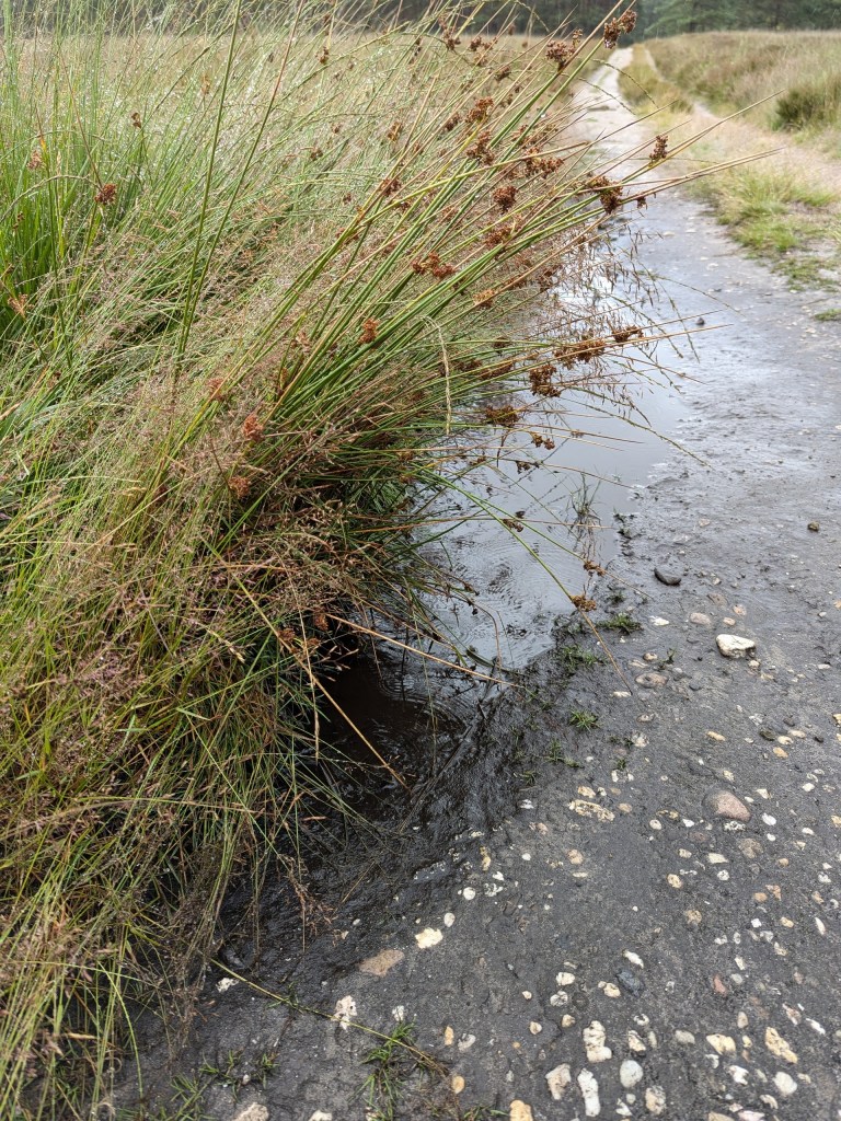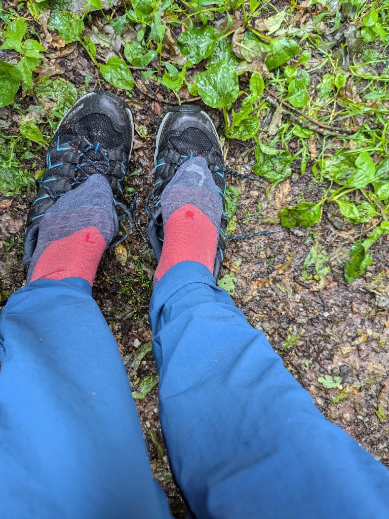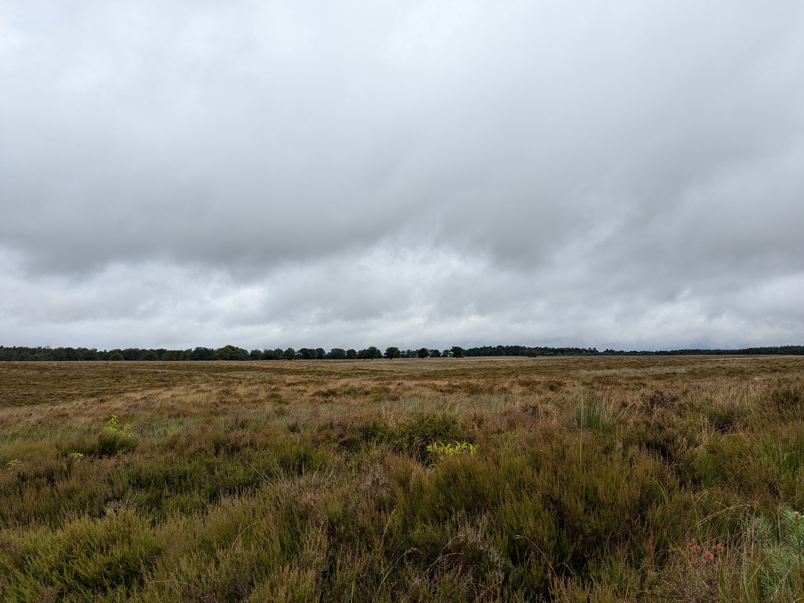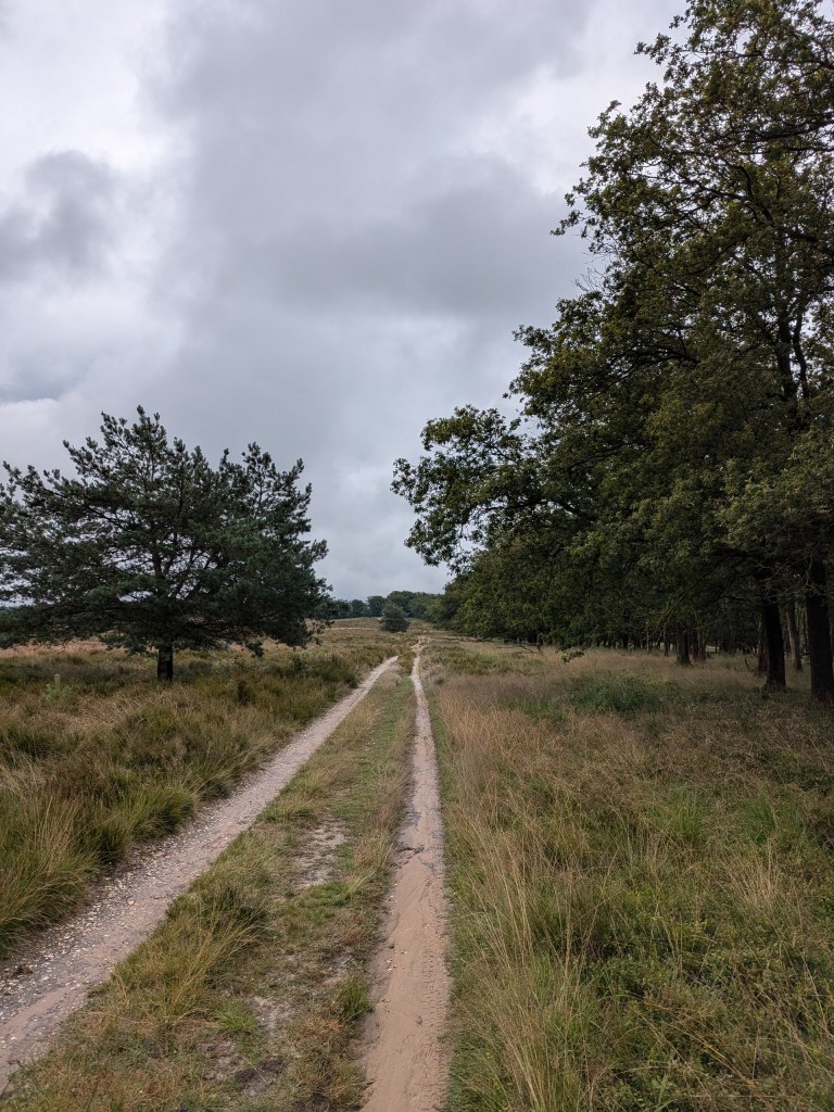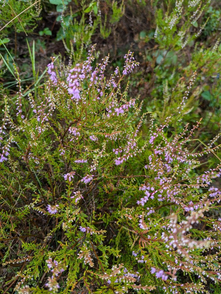 Hier en daar bloeit de heide al. Heel af en toe kwamen we een paar fietsers tegen, maar andere wandelaars hebben we niet gezien. Af en toe vielen er een paar druppels maar halverwege begon het toch serieus te regenen. Helaas hadden we de regenbroek niet meegenomen, wel de regenjas en zo werden onze broeken en benen toch wel erg nat (en koud). Ook de schoenen hielden ons niet droog, we liepen te soppen, je ziet nog een heel klein droog stukje op mijn rechtersok. Tegen het eind van de tocht was het weer droog, gauw naar huis en droge kleren aangetrokken.