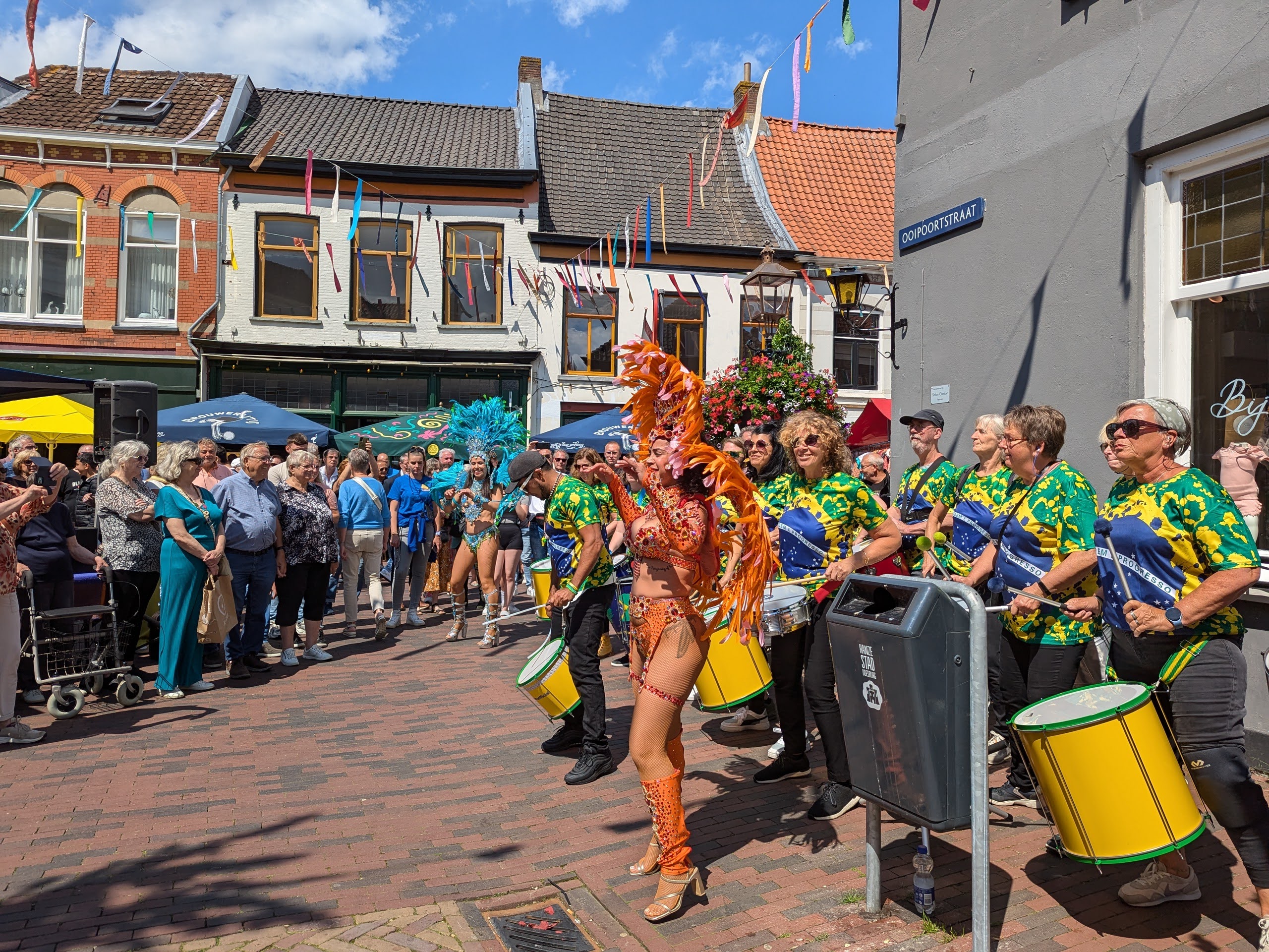 Vandaag was het gelukkig heerlijk weer, heel fijn voor de organisatoren van Verrassend Doesburg! Ik ben vanmiddag naar de stad gelopen en het was enorm druk, je kon bijna over de hoofden lopen. Ik heb staan genieten van een optreden van een Braziliaanse percussieband met danseressen en acrobatiek.