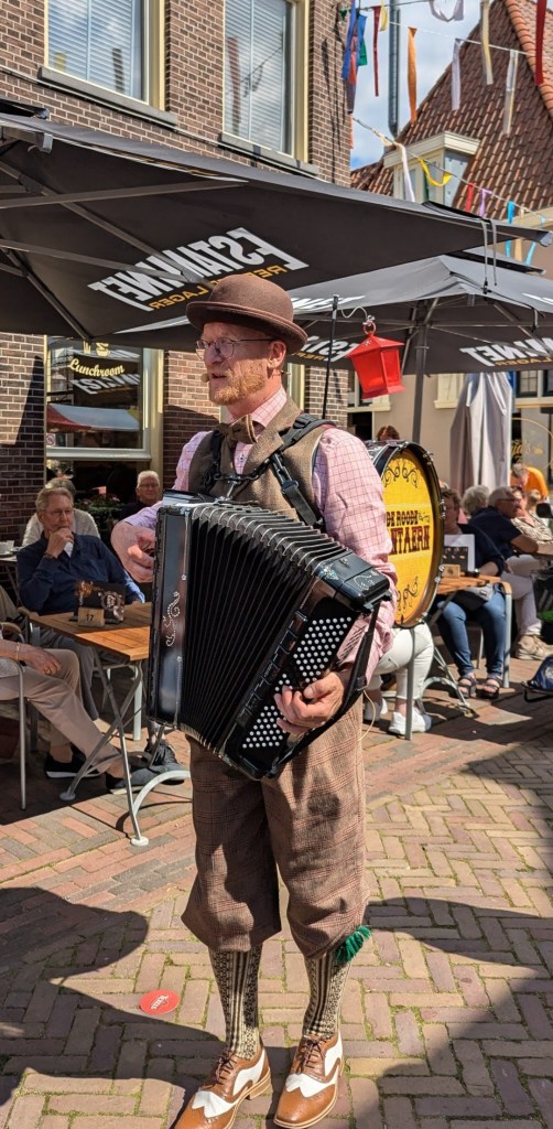 Daarna heb ik een tijd staan kijken bij de Wilhelminafanfare uit Eindhoven met aanstekelijke muziek en zang. Het leuke was dat ze vanmorgen ook al optraden in de kerkdienst in de Martinikerk. Ze hadden een plaats nodig om hun instrumenten te stallen en wilden wel meewerken aan de dienst, heel verrassend. Het thema van de dienst was: Daar zit muziek in. De fanfare speelde o.a. God only knows, Going home, Chiquitita en Mary don’t you weep, waarbij ook gezongen werd.