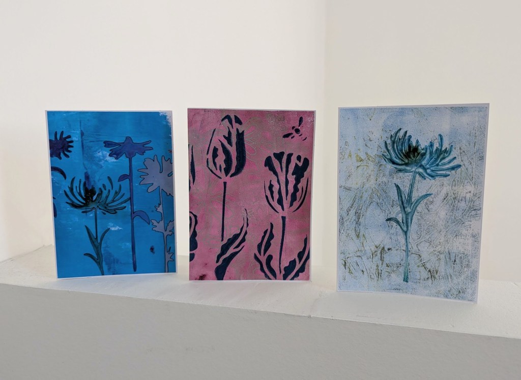 Mooie kaarten heb je gemaakt. Stokrozen had ik vroeger ook in de tuin, bijna zwarte. Ik moet bij stokrozen altijd aan Denemarken denken. Groet, Dientje