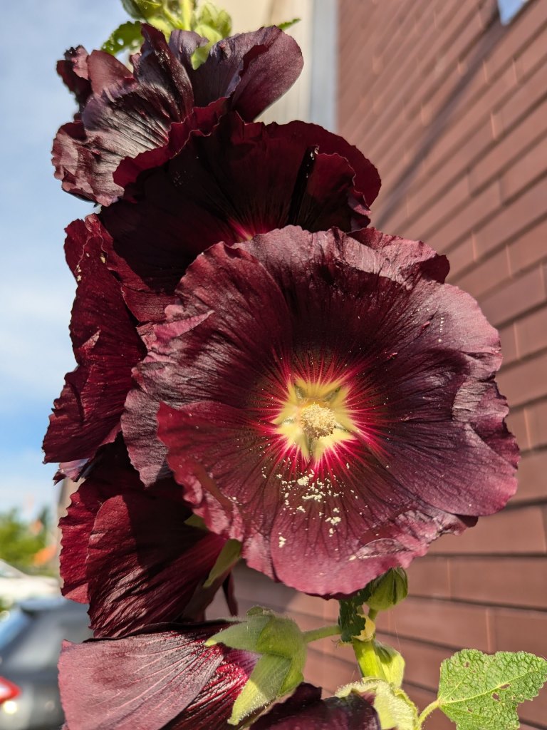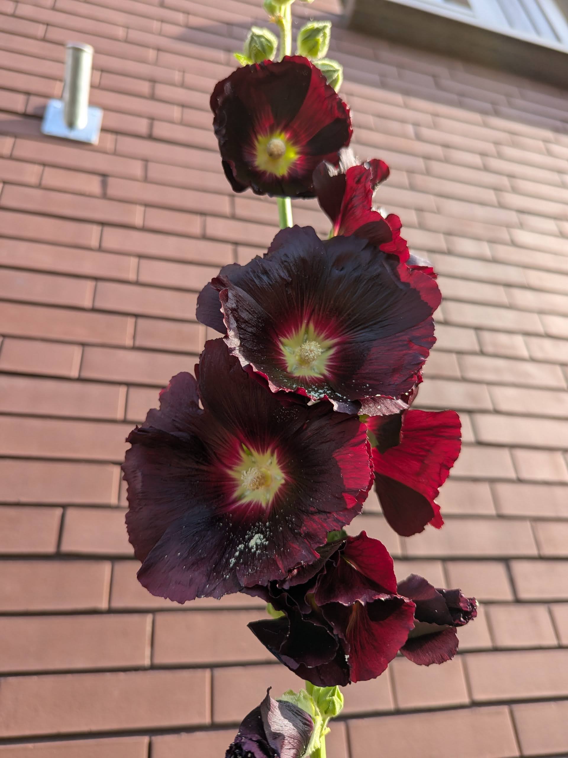 Aat had vorig jaar stokrozen gezaaid en de plantjes rond het huis gezet. Aan de zijkant doen ze het nog niet zo goed maar voor en achter wel. Achter zijn het lichte bloemen en voor heel donkere, bijna zwart.