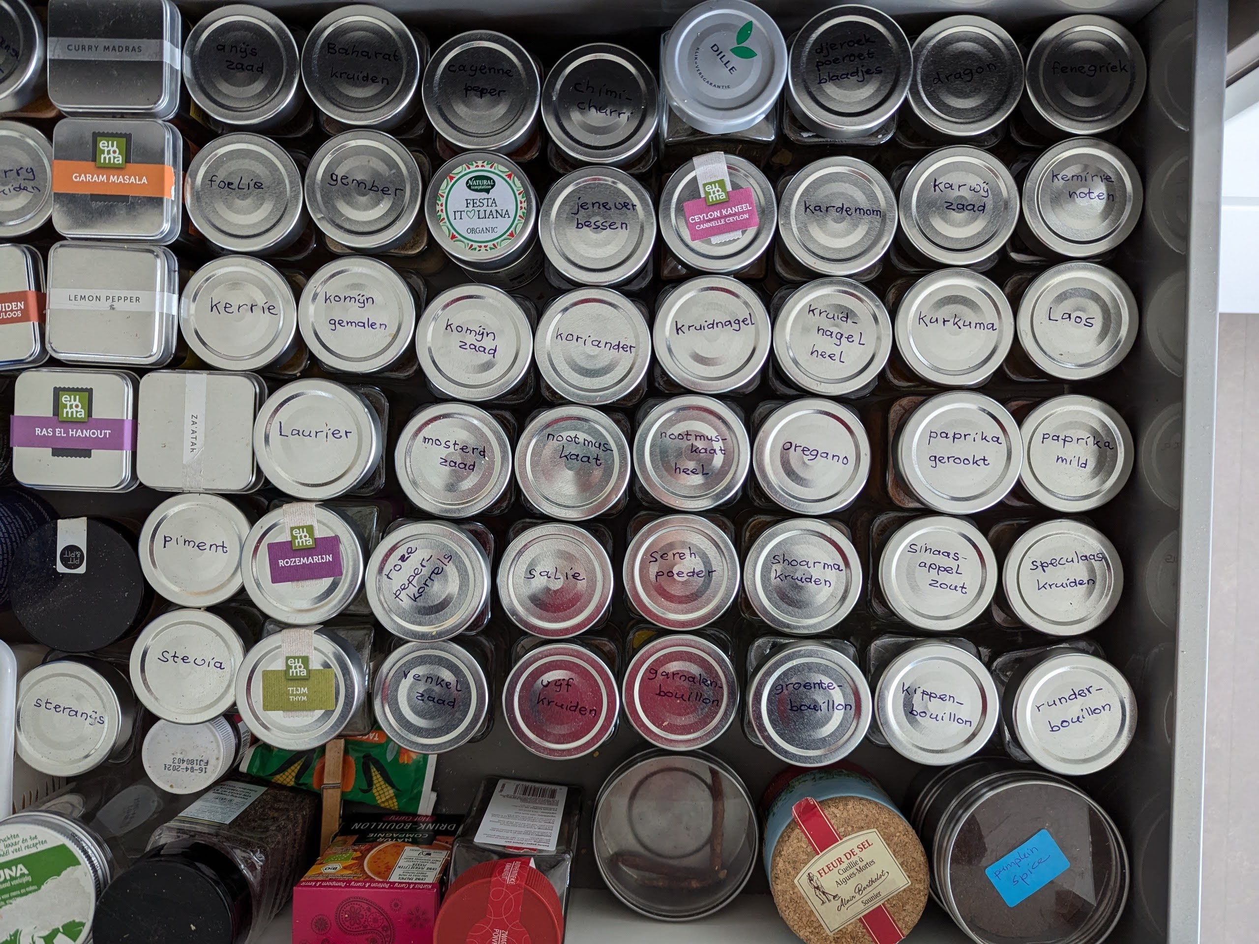 Meestal ben ik niet zo georganiseerd hoor, en die kruiden staan pas 3 jaar op deze manier in de la, daarvoor was het ook een nonchalante bende, maar omdat mijn man tegenwoordig ook regelmatig kookt is het toch wel erg handig.