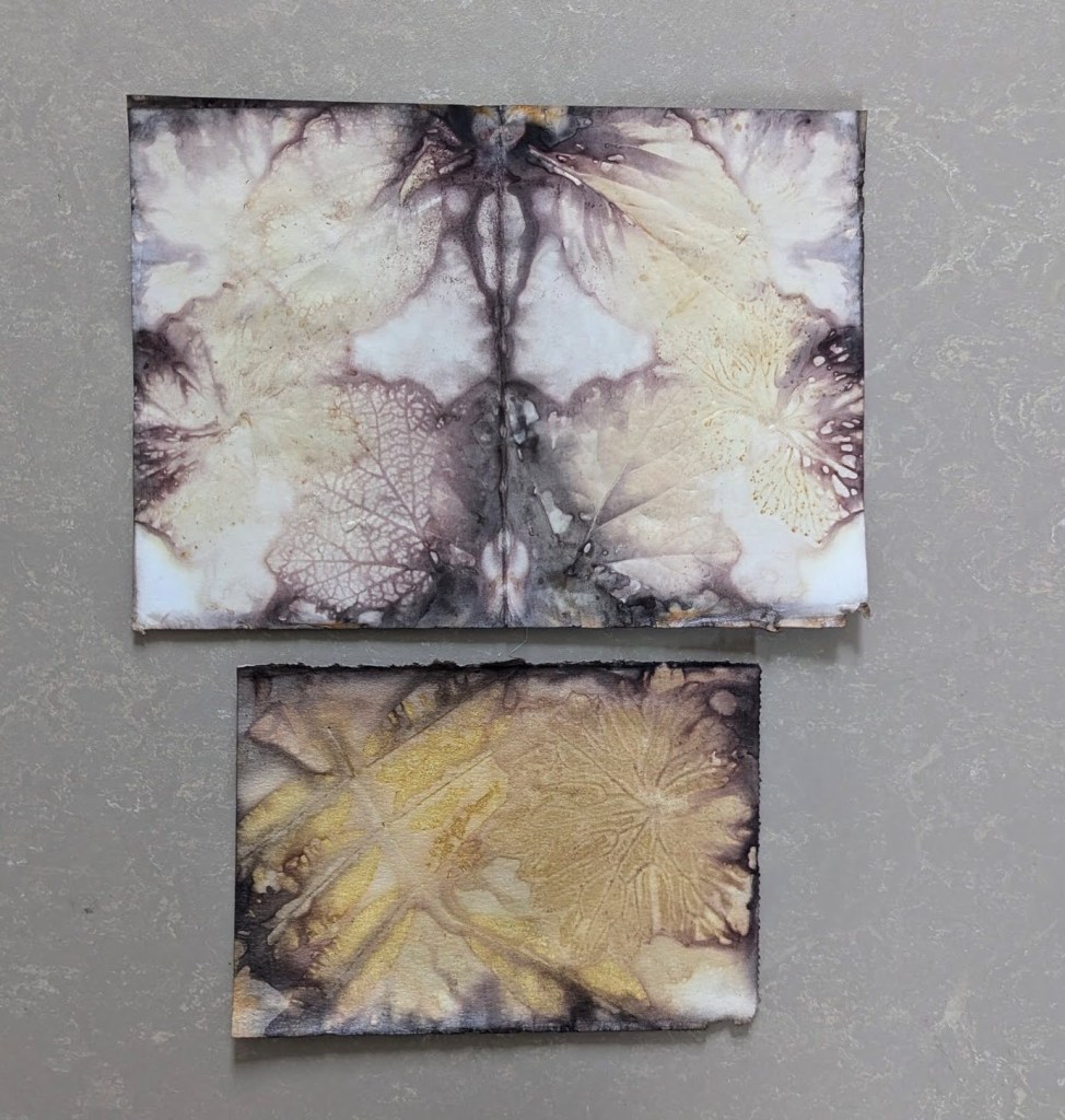 Afgelopen week ben ik weer eens bezig geweest met ecoprints, deze keer op papier. Allerlei soorten bladeren uit de tuin verzameld, stevig papier eerst door een azijnbadje gehaald, de bladeren erop gelegd, aan weerszijden van het stapeltje een glazen plaatje en dit stevig afgebonden met draad (vergeten foto’s te maken). Daarna een paar uur in de rijstkoker in een badje water met ijzersulfaat. De eerste keer had ik teveel ijzersulfaat toegevoegd, de afdrukken werden niet mooi, veel te zwart. De tweede poging is wel aardig gelukt.