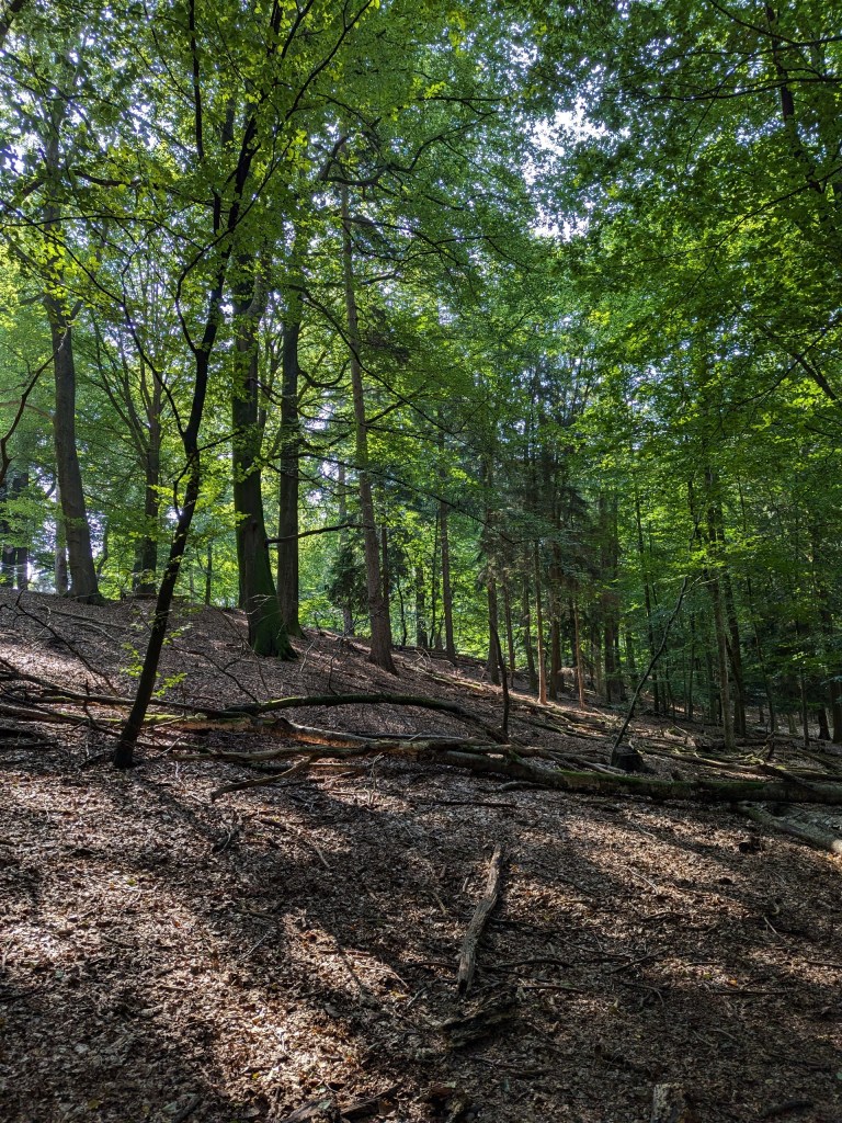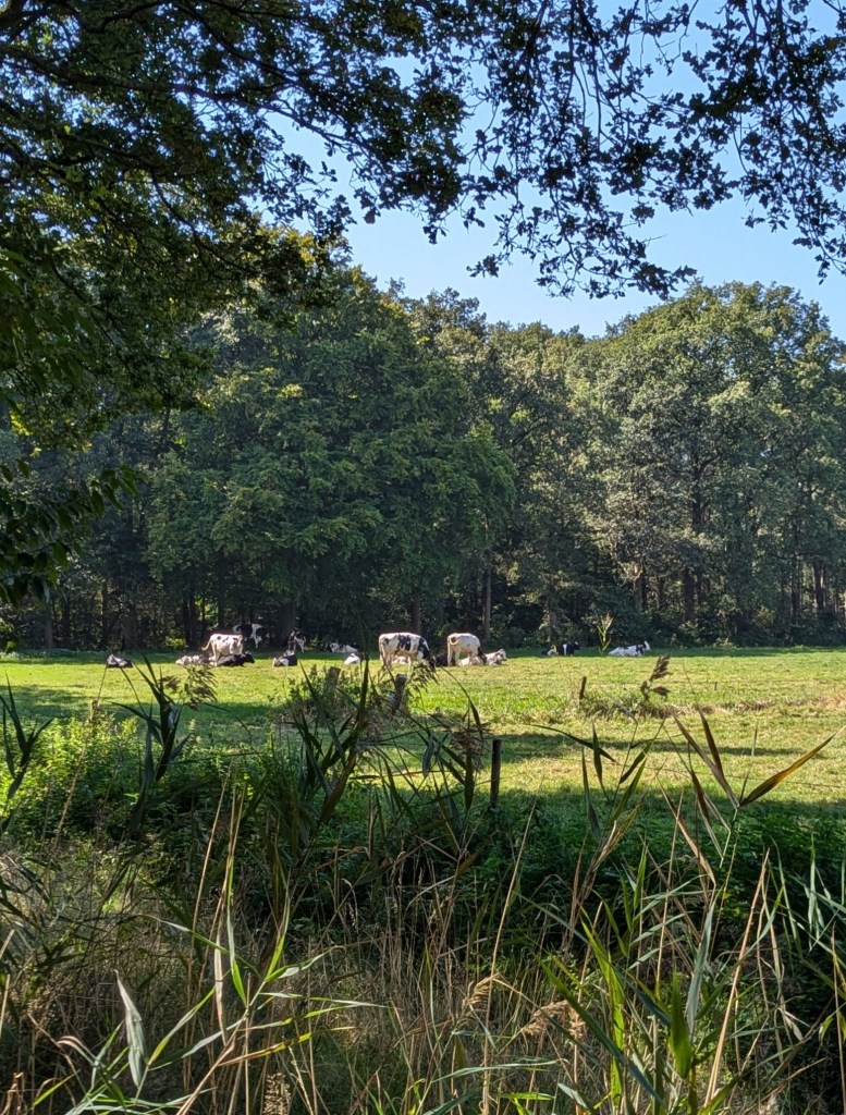 Nadat we de weg bij Spankeren overgestoken waren volgde een rustig stuk, langs weilanden en sloten, en door het bos. Net toen we wilden eten waren er nergens bankjes te zien, dus zijn we maar in het gras gaan zitten.