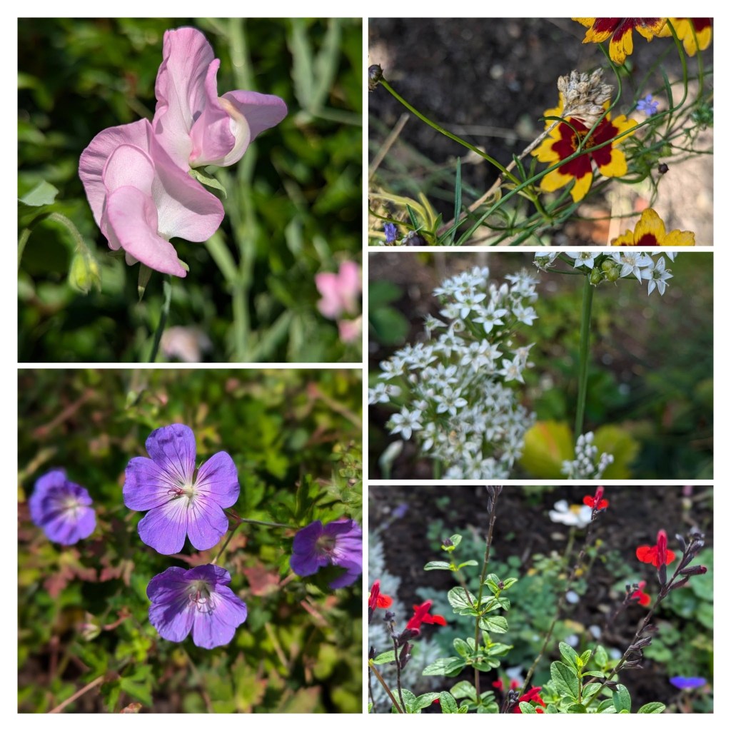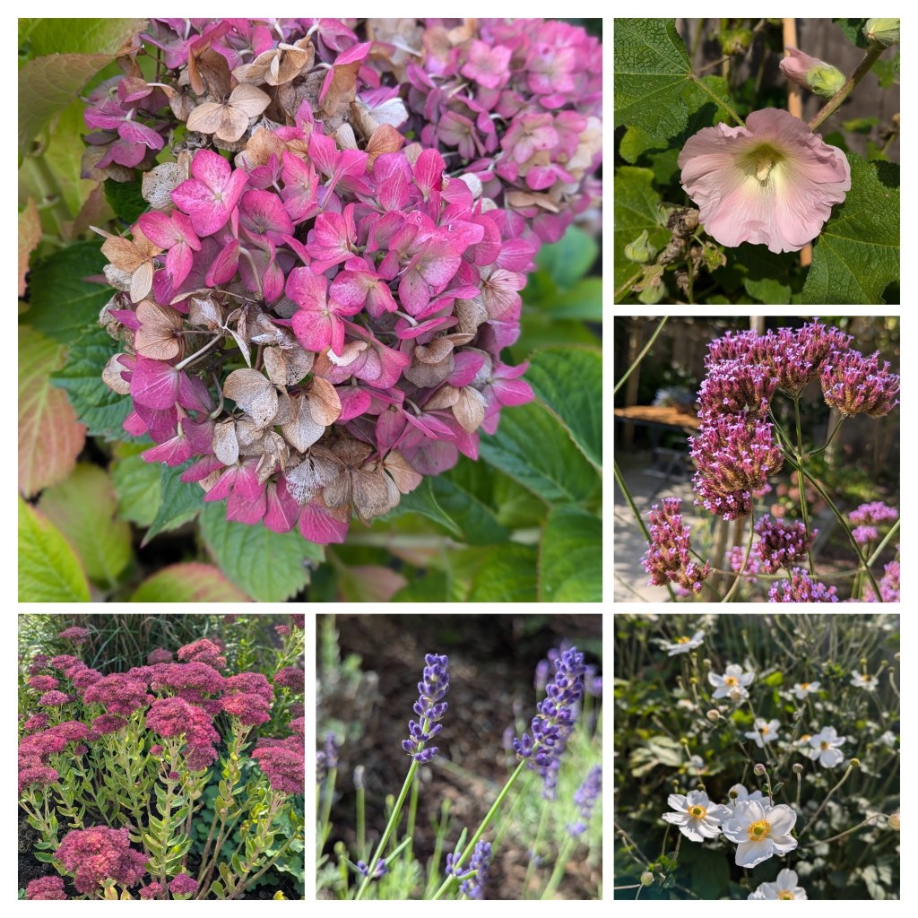 Er is nog zoveel wat bloeit in de tuin, Verbena, Lavendel, Geranium, Stokroos, Japanse Anemoon, Sedum, Lathyrus, enz. Gelukkig schijnt vandaag de zon zodat we er extra van kunnen genieten.