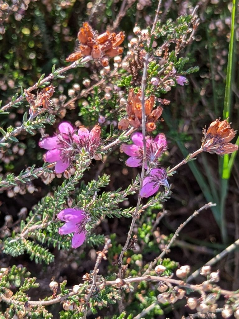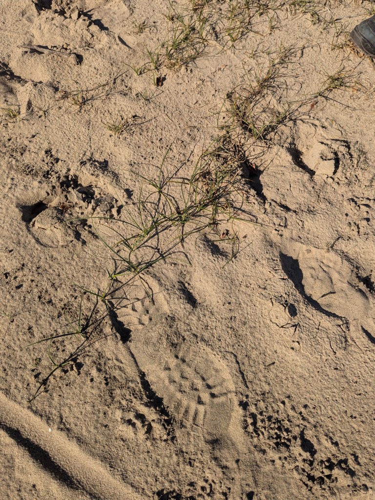 Op het zand groeit ook gras, wat de Duitsers naaimachinegras noemen, de polletjes staan op een rijtje. Ook zagen we nog wat bloeiende dopheide. Halverwege hebben we lekker zitten lunchen in de zon.