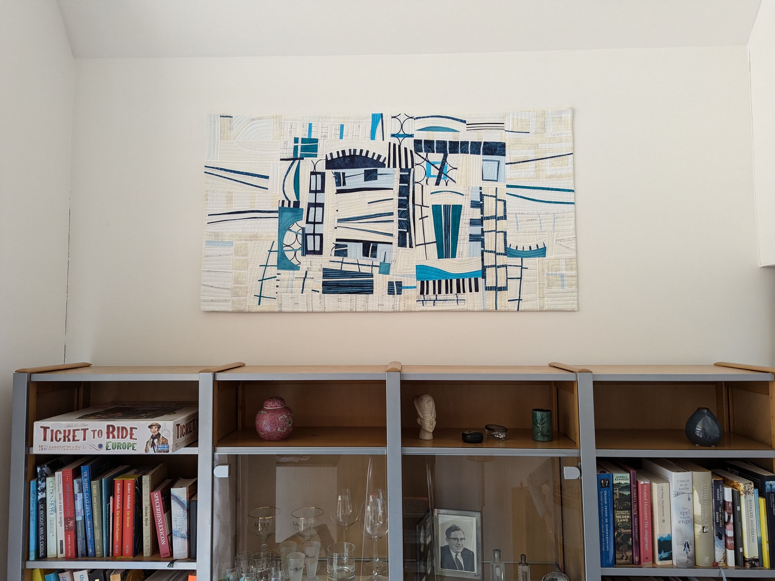 Eind augustus was ik begonnen met wat blokken toen Mieke hier was, half september was de top klaar en daarna was het doorquilten aan de beurt. Ik heb zoveel mogelijk de lijnen van de blokken gevolgd, het meeste met gebroken wit en de blauwe stukken met blauw.