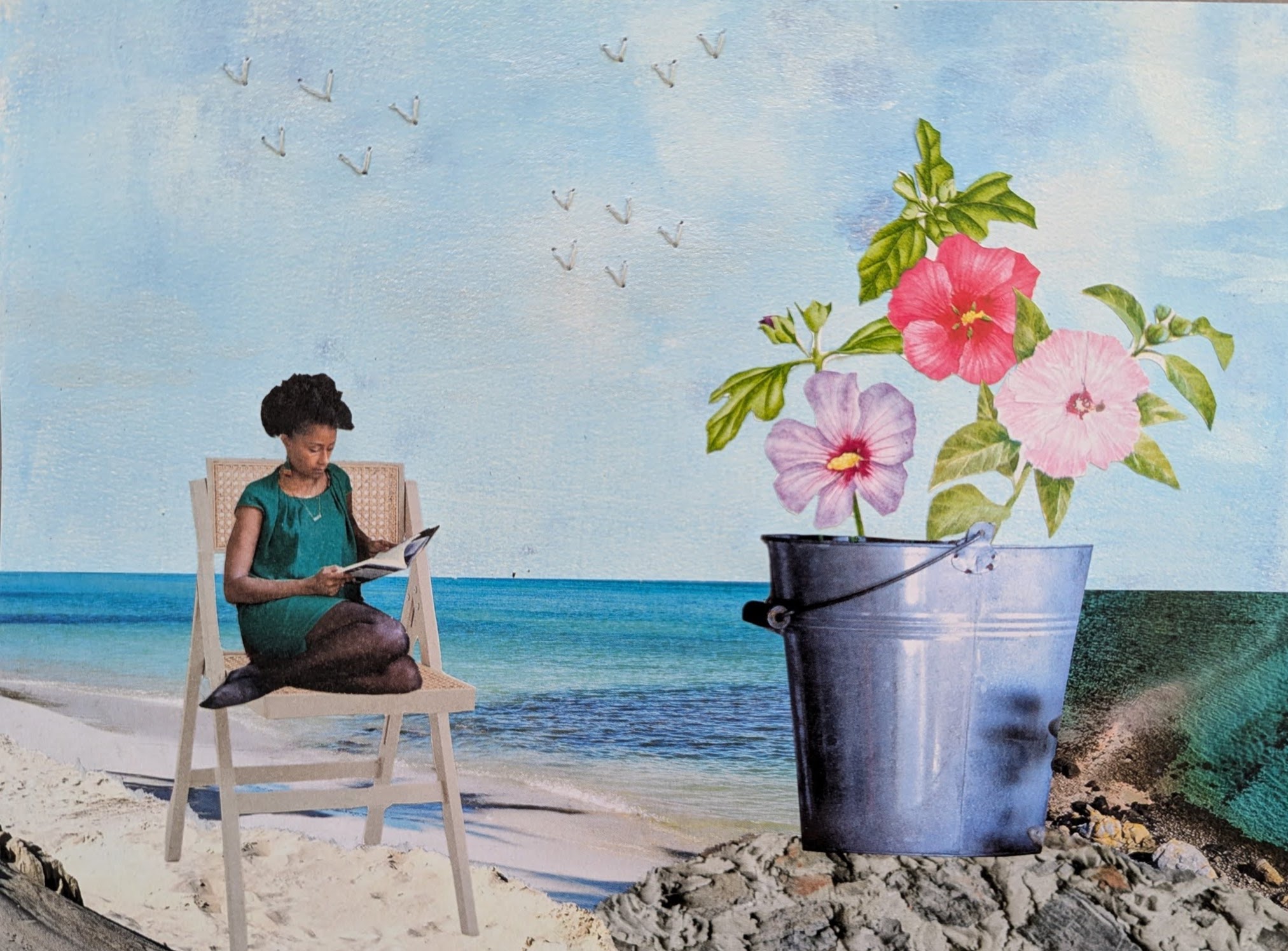 De woorden voor de collage van deze week zijn: metallic, zee, stoel, hibiscus. Een stoel was snel gevonden evenals wat plaatjes van hibiscusbloemen, maar met zee had ik deze week de meeste moeite. Toch wilde ik geen wisselwoord gebruiken, ik houd van de zee, gelukkig vond ik uiteindelijk een plaatje in een tijdschrift van de kringloop. Nog wat stukjes zand en stenen gescheurd en geplakt voor de voorgrond, de stoel staat zo in het zand.