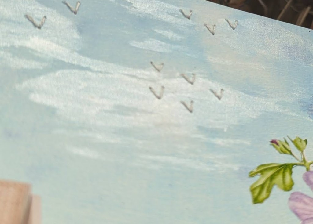 De emmer staat voor metallic en ik heb nog wat wolkjes geverfd met metallic verf al is dat niet goed te zien op de foto. De achtergrond is geverfd met de gelli plate.