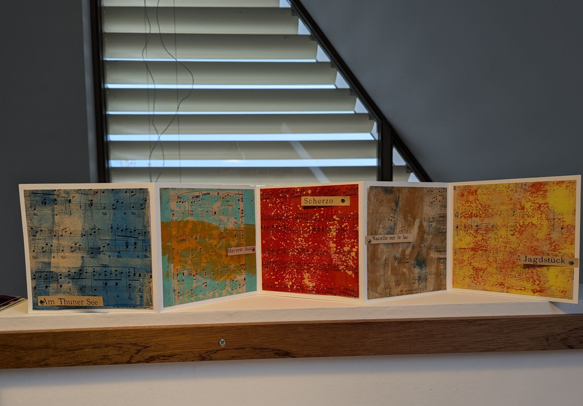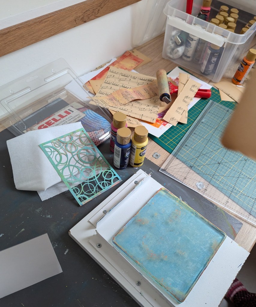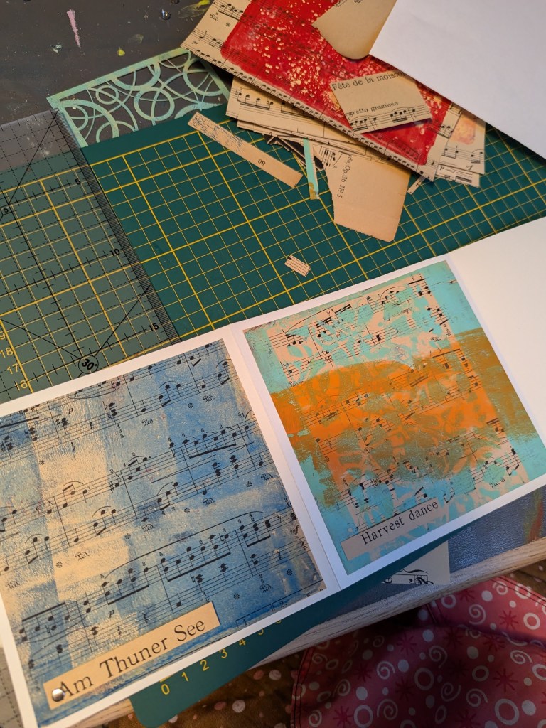 Ik had bij de kringloop een leporello boekwerk gekocht met héél veel bladzijden, daar heb ik een stuk uitgeknipt om een kleinere te maken, voorlopig kan ik nog heel wat leporello’s maken en Mieke had grote vellen papier waar ze een stuk afsneed. Ze verfde muziekpapier en plakte dit erop. Ik had al verschillende vellen voorbereid en heb deze verder afgewerkt. Een tijdje terug las ik iets over resist op de gelli plate met baby poeder en daar krijg je erg leuke achtergronden van.
