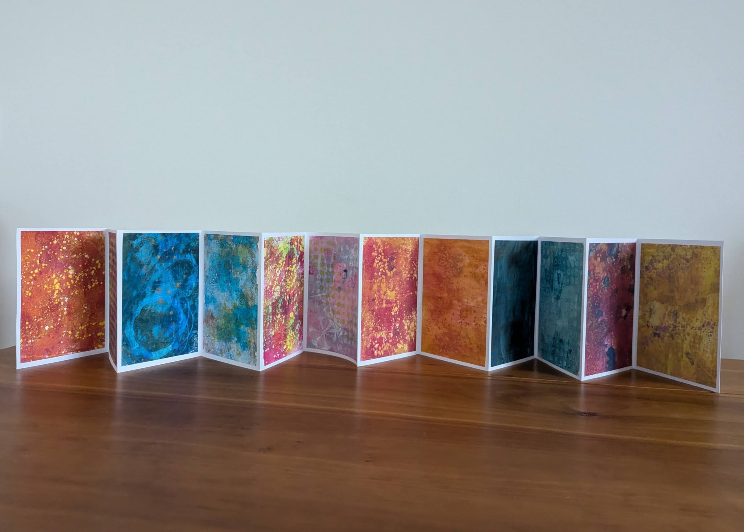 Gisteren kwam Mieke weer hier om iets creatiefs te doen. Ze had haar gelli plate, verf en papier meegebracht en we gingen een leporello maken, oftewel een harmonicaboek. Na de koffie met een lekker stukje chocoladetaart gingen we aan de slag, eerst zag het er nog onoverzichtelijk en rommelig uit maar gaandeweg ontstonden er mooie dingen.
