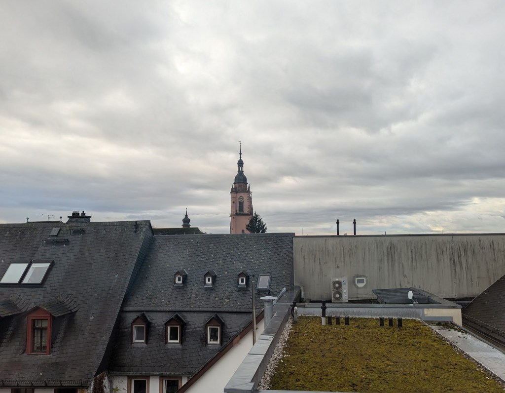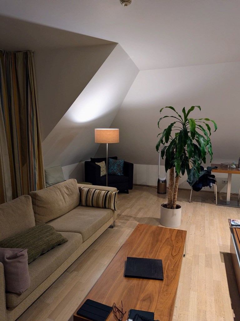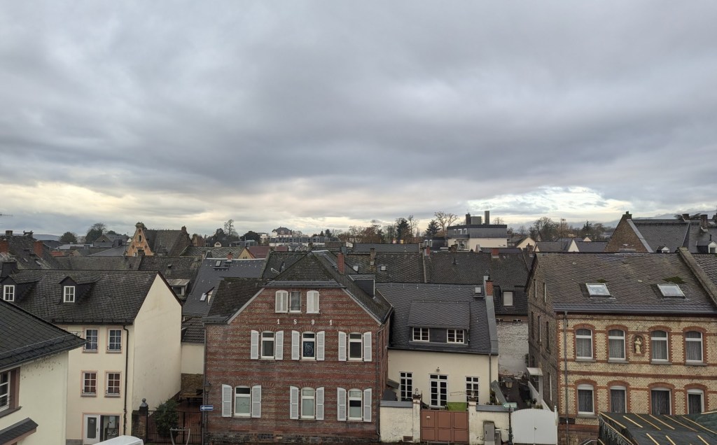 Gistermorgen zijn we uit Grafrath vertrokken na een paar gezellige dagen met de kinderen. Zoals Ger al opmerkte is het jammer dat je niet even op de koffie kan bij je kinderen maar als je gaat dan ga je ook gelijk een paar dagen. We hadden geen zin om in één keer naar huis te rijden en hadden een hotel geboekt in Eltville am Rhein, Das Spritzenhaus. Hier waren we 3 jaar geleden ook geweest en dat was ons goed bevallen. Onderweg hadden we prachtig weer, de temperatuur tikte zelfs even de 20 graden aan! We waren even na 4 uur bij het hotel en tot onze verrassing hadden we een upgrade gekregen, nl. de torenkamer. Het hotel was vroeger een brandweerkazerne en helemaal bovenin werden de slangen uitgehangen om te drogen. Nu was er een zitje gemaakt met uitzicht over de stad. Via een hoge trap kwam je in het kamertje.