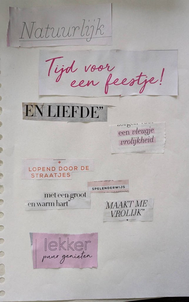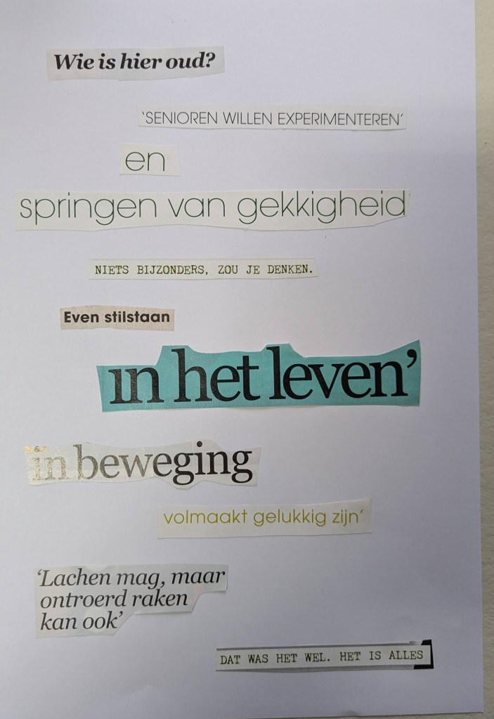 De bedoeling is om er thuis verder mee te gaan. Na de lunch werd het een vrolijke boel, we gingen aan de slag met tijdschriften. Eerst knipten we woorden en zinnen uit die ons aanspraken en daarna maakten we met de woorden een “gedicht”. Iedereen droeg zijn eigen gedicht voor, wat hebben we gelachen. Als voorbeeld zie je links mijn gedicht en rechts die van Annemiek.