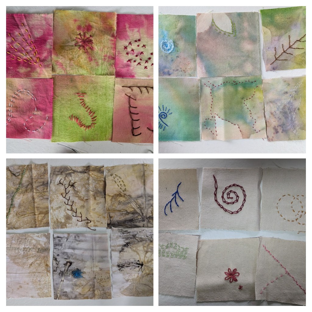 Vandaag kwamen we weer bij elkaar met de groep Achterdoek. Meestal bereidt iemand iets voor en deze keer kregen we verschillende opdrachten. Voor de lunch gingen we aan de slag met kleine lapjes die verdeeld werden onder elkaar zodat iedereen 6 verschillende lapjes had. Daarna kreeg je telkens 5 minuten de tijd om op een lapje wat te borduren. Tenslotte kreeg je je eigen lapjes weer terug. Hier een paar resultaten.