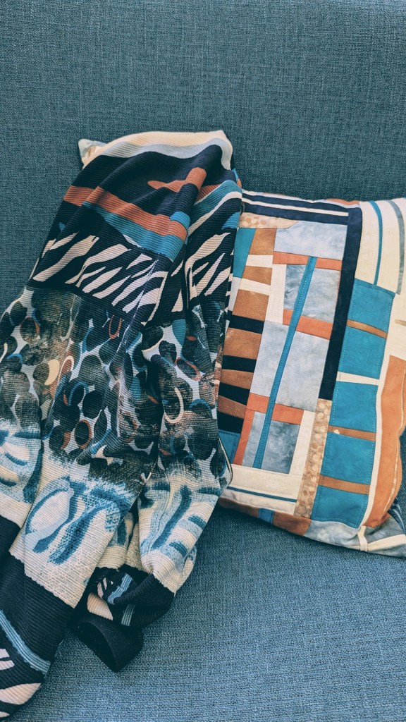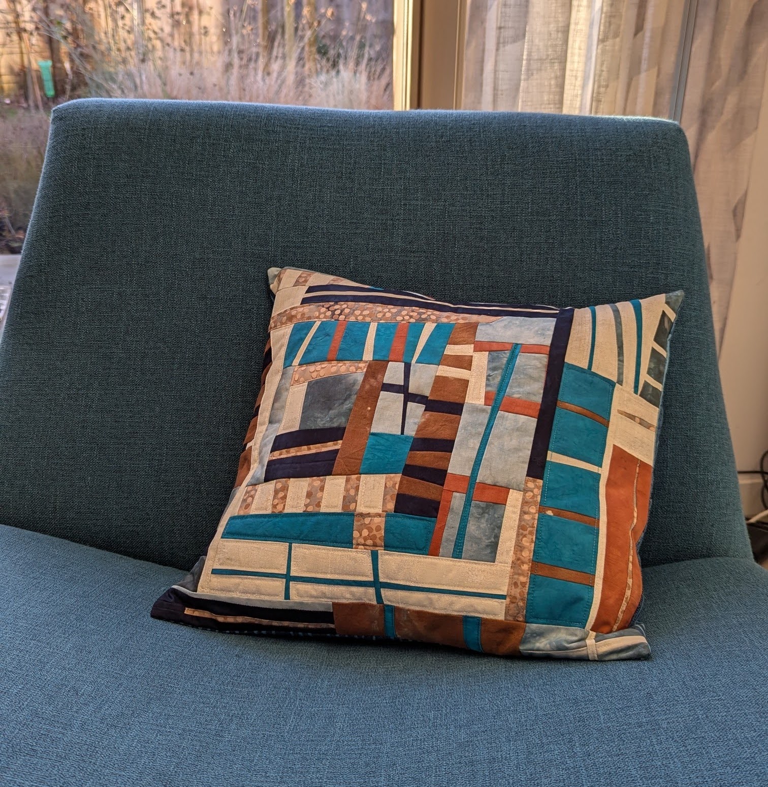 Inspiratie kan overal vandaan komen, een tijdje terug lag mijn vestje over de stoel en die kleuren pasten er zo goed bij dat ik besloot om met die kleuren het hoesje te maken. Het blauw van de stoel is in het echt meer petrol, maar komt niet zo goed uit op de foto.